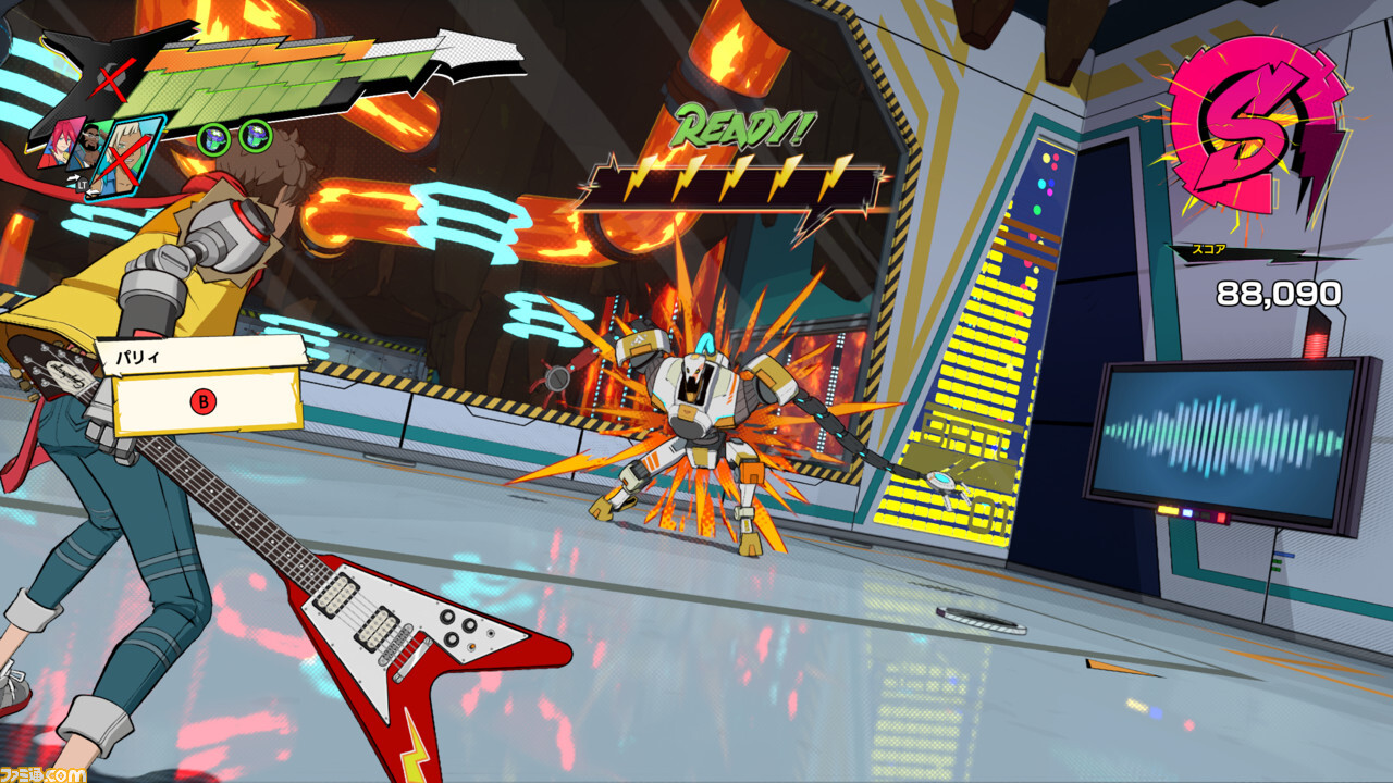 리듬을 즐겁게 해 플레이를 보조하는 기능으로서, 「Hi-Fi RUSH」에서는 버튼 입력이 리듬과 일치하고 있을 때는 효과음이 흐르게 되어 있다. 적을 때리면 기타가 울리고, 닷지를 하면 하이햇이 울린다는 식으로. 그 밖에도 핸드크랩이나 목소리 등, 효과음의 바리에이션은 셀 수 없을 정도로 다채롭다. 이러한 조건 덕분에 실제로 악기를 연주하는 것 같은 감각이 탄생한다. 게임과 악기, 양쪽의 “플레이”가 공명해, 바이브스가 부치 오르는 것이다.