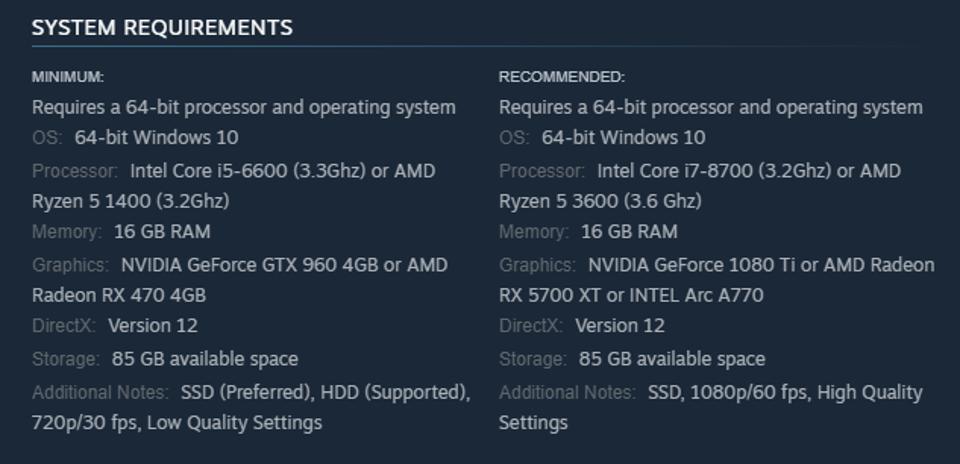 보시다시피 게임을 실행하려면 최소한 Windows 10(또는 11)과 DirectX 12가 필요합니다. 최소 요구 사항은 다음과 같습니다.