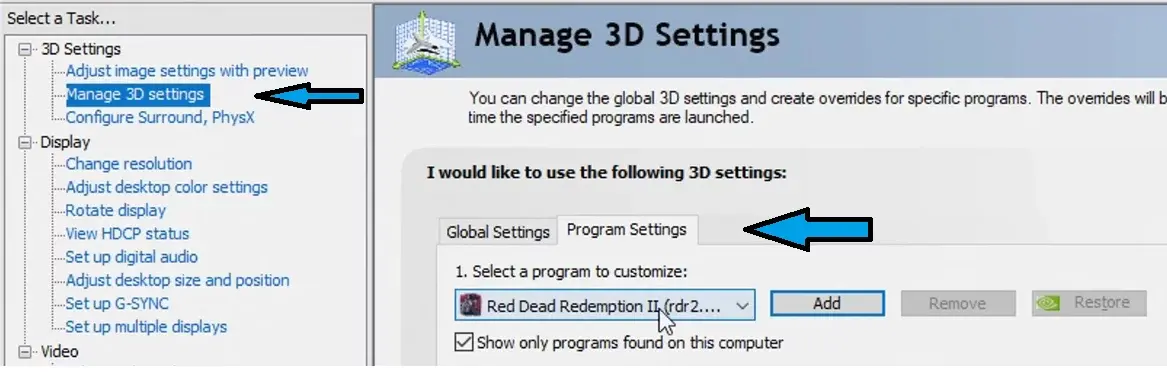 프로그램 설정에서 찾아보기를 클릭하고 Red Dead Redemption 2 또는 rd2.exe 응용 프로그램을 찾습니다.