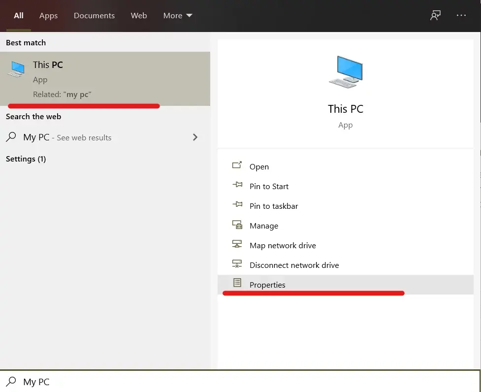 시작 > 내 PC 입력 > "내 PC"를 마우스 오른쪽 버튼으로 클릭하고 속성을 누르십시오.