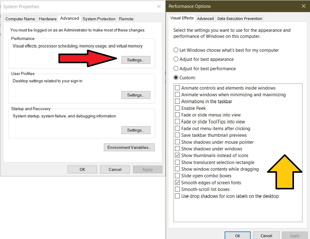 그런 다음 성능 아래에 있는 설정을 클릭합니다.이제 옵션이 있는 거대한 보조 탭이 표시되며 사용자 정의를 클릭하고 팔로우 설정만 확인하기만 하면 됩니다.