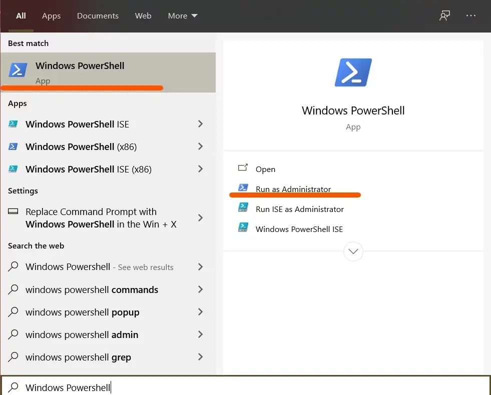시작 > Windows PowerShell 입력 > 관리 권한으로 첫 번째 결과 열기로 이동합니다.