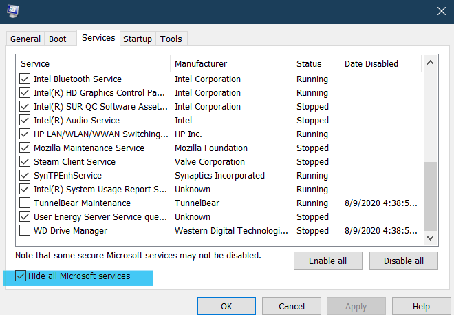 서비스 탭에서 "모든 Microsoft서비스비활성화 "를 선택하십시오.이렇게 하면 비활성화하면 안 되는 필수 항목이 숨겨집니다.이제 새 목록에서 관련이 없고 불필요하다고 생각되는 항목을 비활성화하십시오.