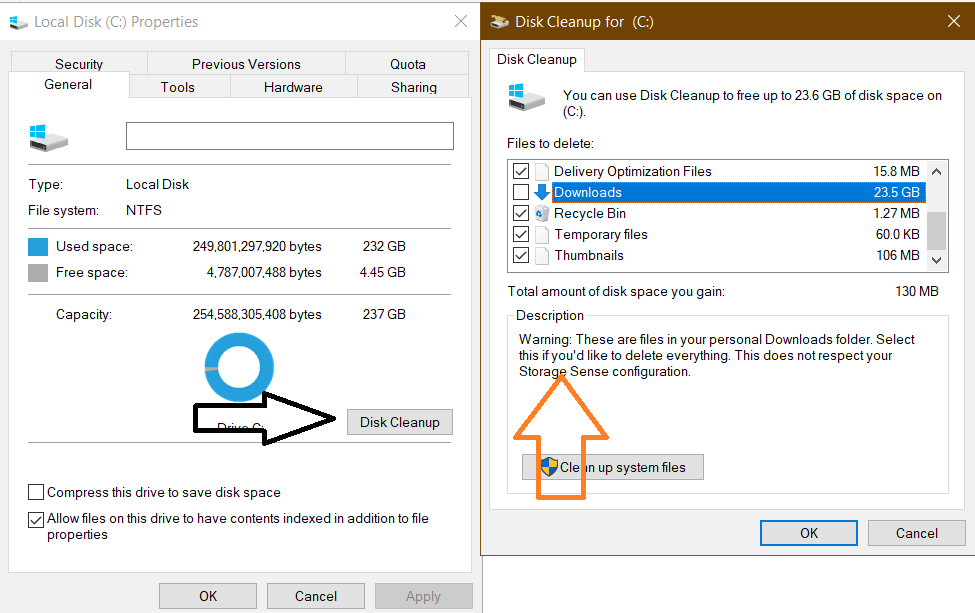 그런 다음 디스크 정리를 클릭하고 나열된 모든 폴더를 살펴봅니다.내 다운로드 폴더에 있는 파일이 삭제되는 것을 원하지 않으므로 이에 동의하지 않겠습니다.마찬가지로 삭제할 때 주의하십시오.파일을 선택했으면 "선택한 파일 정리"를 클릭하고 확인을 누릅니다.