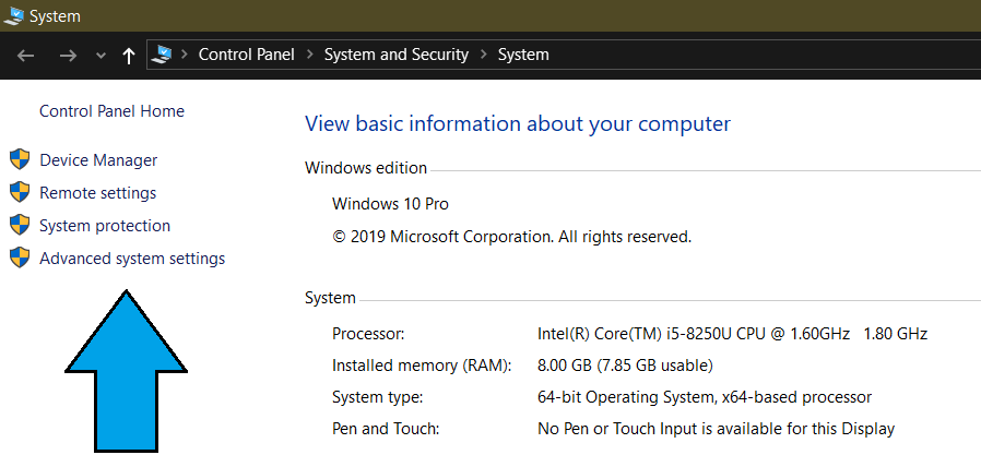 그런 다음 고급 시스템 설정을 클릭하십시오.