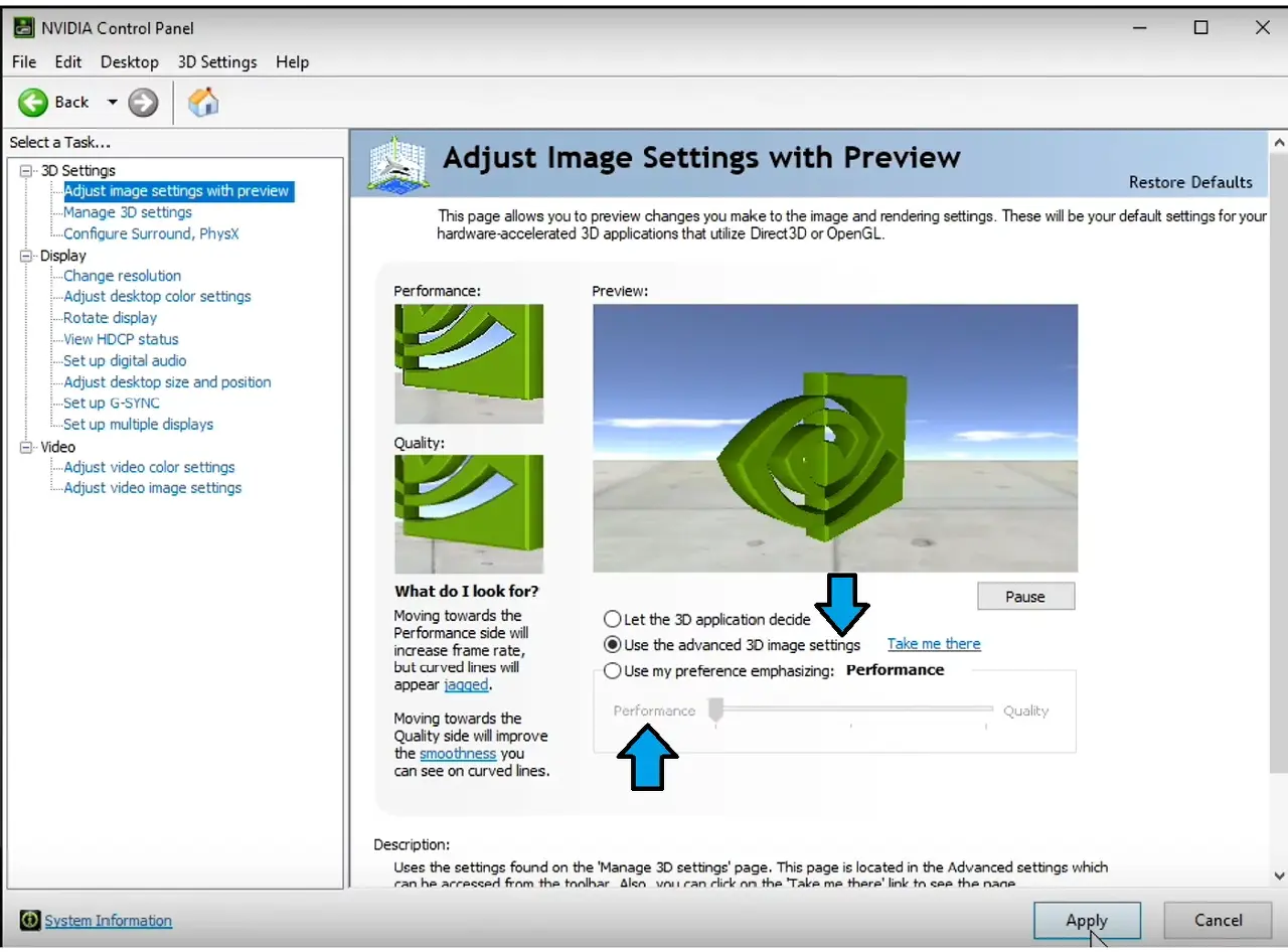 그런 다음 고급 3D 이미지 설정을 확인하고 적용을 누르십시오.