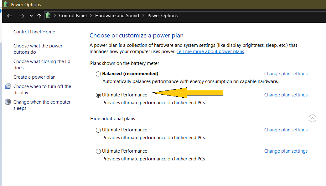 이제 궁극의 성능 계획을 클릭하십시오.때로는 숨겨져 있지만 추가 계획 숨기기 설정에서 바로 찾을 수 있습니다.