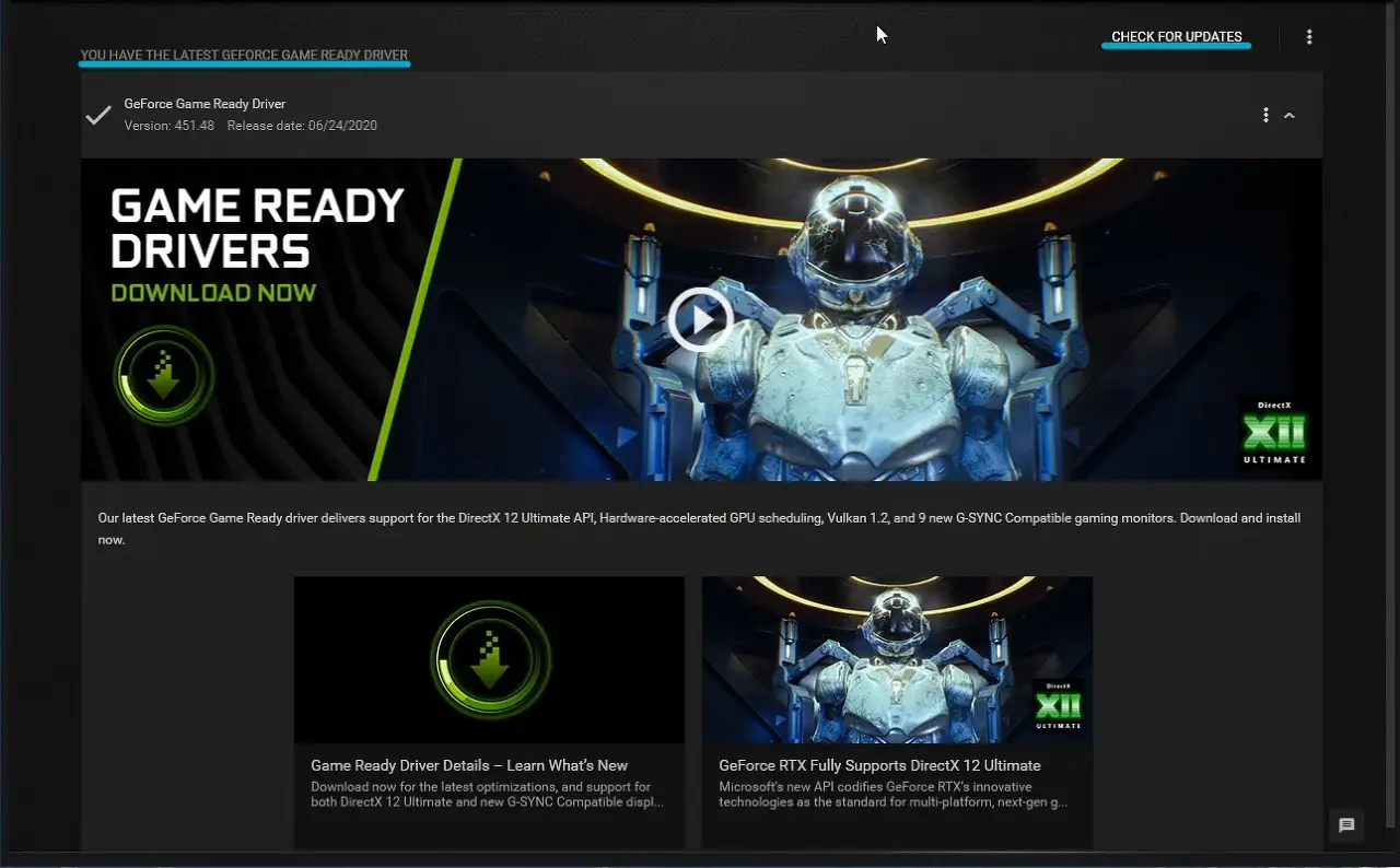오른쪽 상단에서 업데이트 확인을 클릭합니다.새 드라이버를 사용할 수 있는 경우 자동으로 다운로드됩니다.이후 Red Dead Redemption 2 Game Ready 드라이버를 수동으로 다운로드하려면여기를 클릭하십시오.