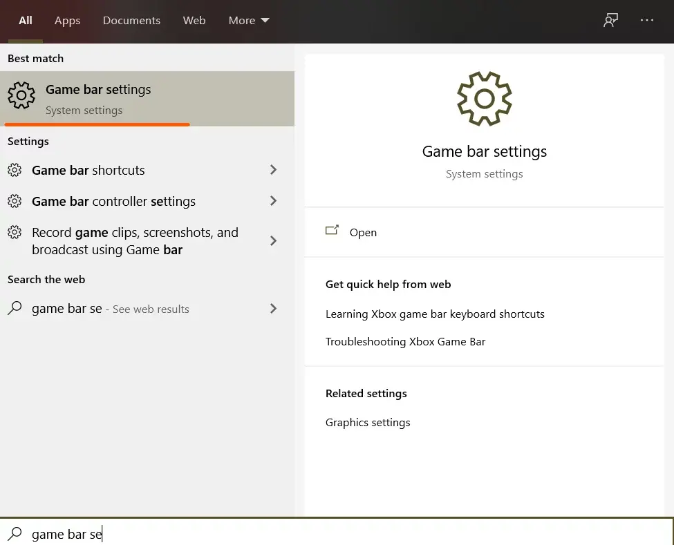 시작 > 유형 게임 바 설정 > 첫 번째 결과 열기를 엽니다.