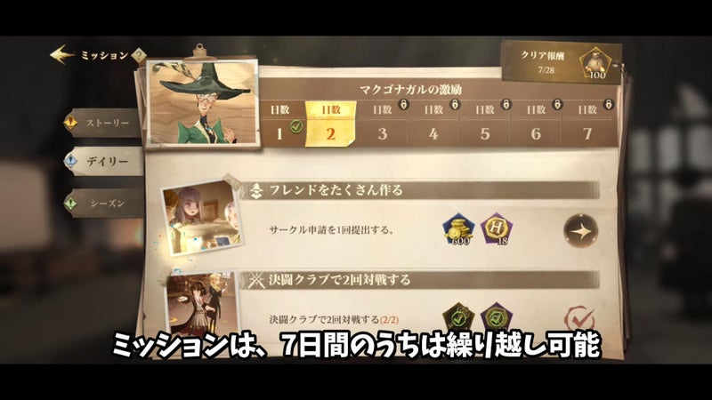즉, 1일째의 미션은 7일간 도전할 수 있고, 2일째는 6일간, 3일째는 5일간… 7일째만은 이월할 수 없으니 조심해 주세요.