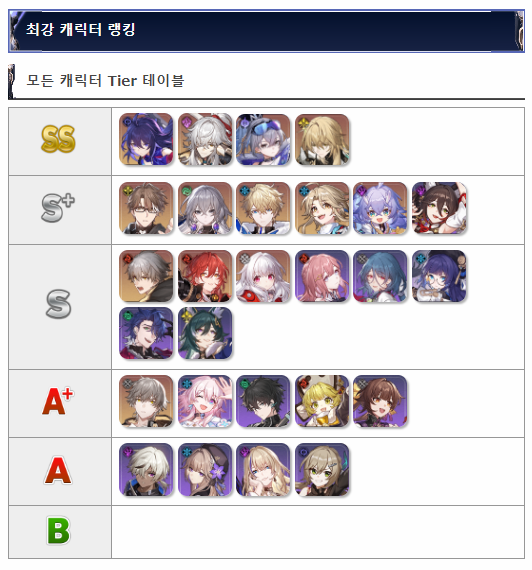 모든 캐릭터 Tier 테이블