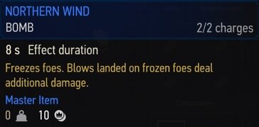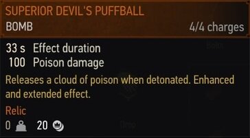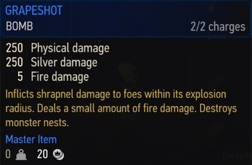 폭탄은 적에게 사용되는 소모품입니다. 일부 폭탄은 피해를 입히고, 다른 폭탄은 디버프를 적용하며, 일부는 유틸리티 효과도 있고, 일부는 몬스터 둥지를 파괴하는 데 사용할 수 있습니다.폭탄에는 기본, 강화, 슈피리어의 세 가지 등급이 있습니다. 각 버전은 더 강력하고 추가 보너스 또는 특전이 추가됩니다. 폭탄은 중간에 물약 과 달인이 있는 오른쪽 슬롯을 차지하고 인벤토리의 왼쪽에는 오일이 있습니다.
