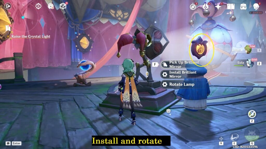 근처에 있는 파란색 브릴리언트 미러를 램프에 설치하고 회전시켜 진행합니다. 여기서 퀘스트가 종료됩니다.
