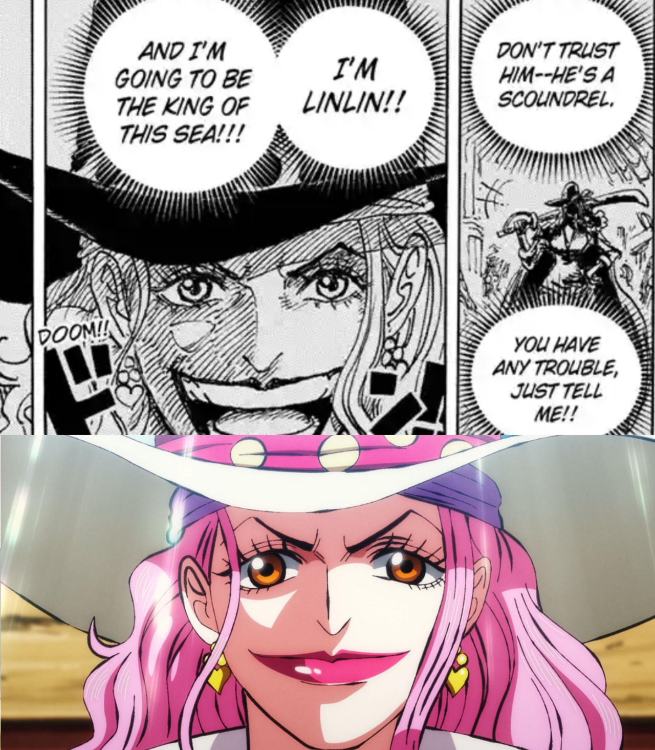 거의 80개의 에피소드가 끝난 후 애니메이션 각색 시청자는 처음으로 그녀의 24세 모습을 보게 되었습니다. 빅맘이 "이 바다의 왕"이 되고 싶다고 말하는 순간. 아래에서 Toei의 각색과 비교하여 1041st의 장면을 볼 수 있습니다 .