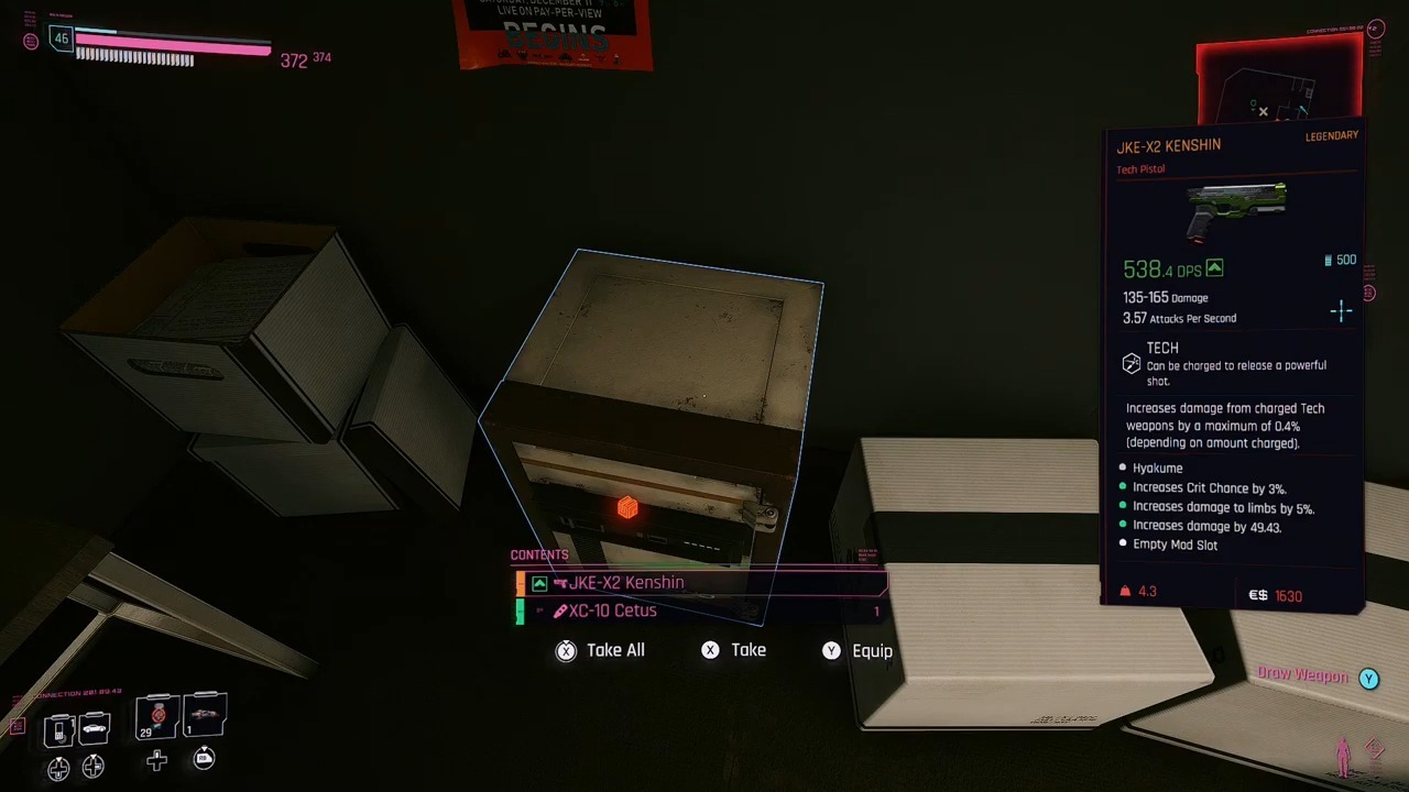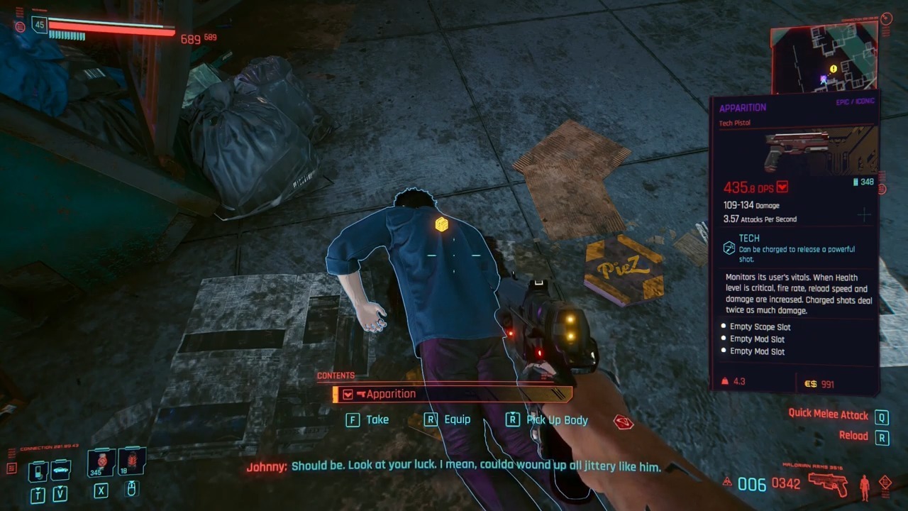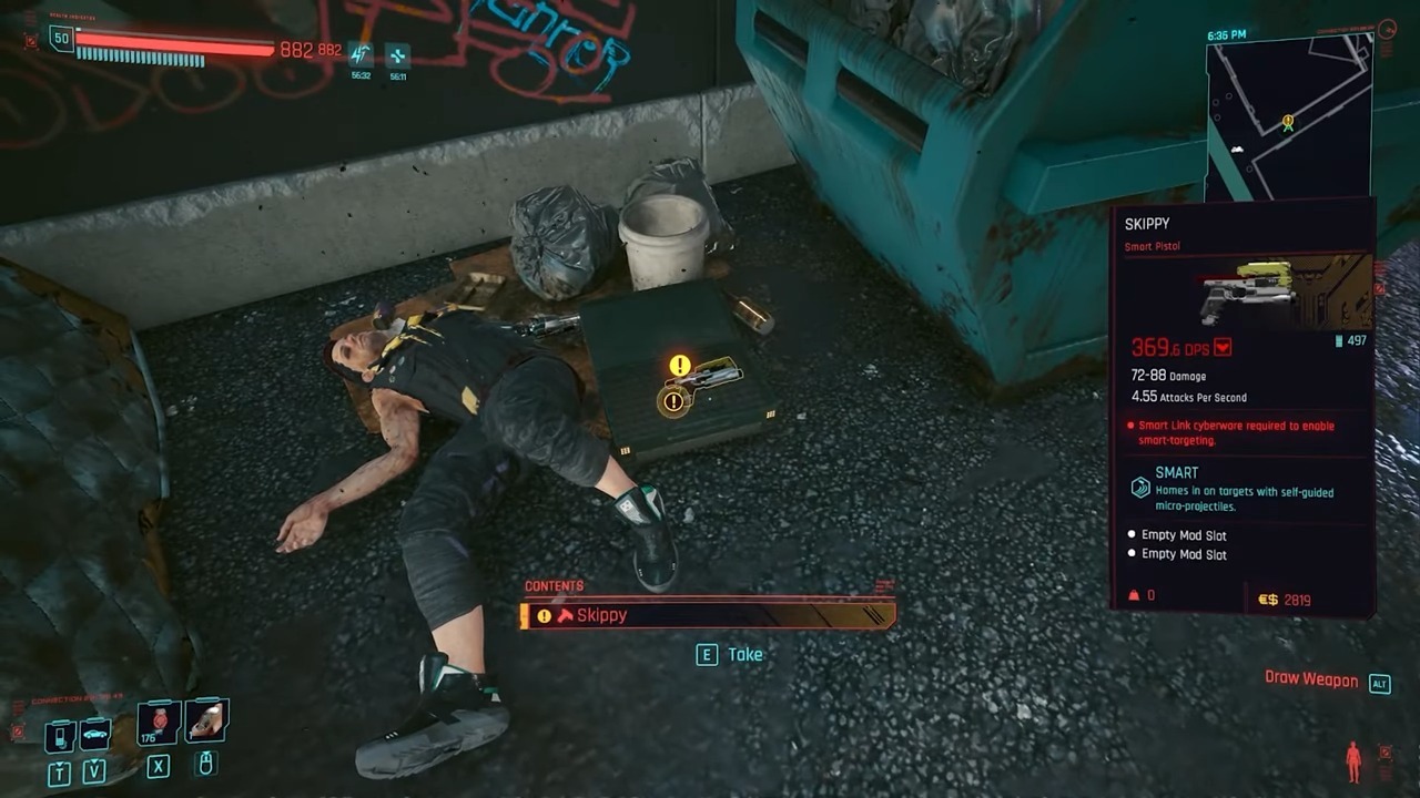 인수에 관한 한, 권총은 사이버펑크 2077의 최고의 초기 권총이며 비스타 델 레이의 골목길에서 구할 수 있습니다.이 지역에서 플레이어는 몸 옆에서 무기를 찾을 수 있습니다.