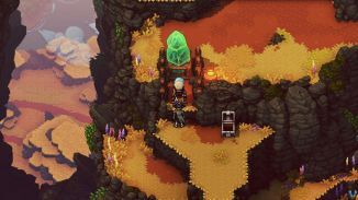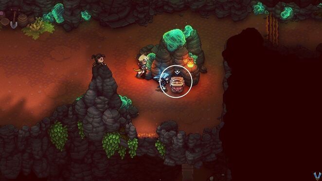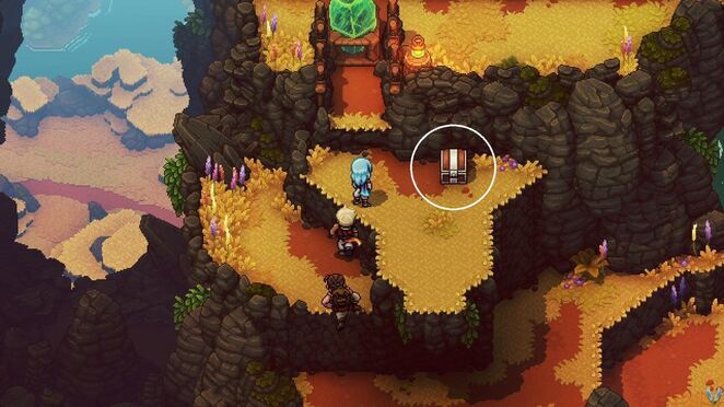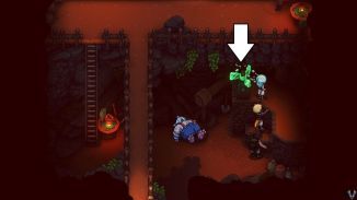 밖으로 나가서 기둥을 오른쪽으로 밀어서 계속 진행하세요. 가는 길에 이곳의 베리 덤불 사다리를 타고 올라갔다가 아래로 뛰어내리세요. 먼저 여기서 아래쪽 길로 내려가세요. 여기에는 죽여야 할 적과 상자, 식물이 있습니다. 적을 제거한 다음 청록색 호박 광석을 위해 상자를 여십시오 . 토마토 와 노란 피망 도 준비하세요 .