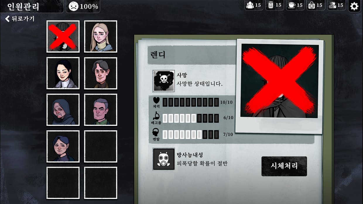 인원 목록을 보면 대피소에 머무르고 있는 생존자들의 상태를 알 수 있습니다.