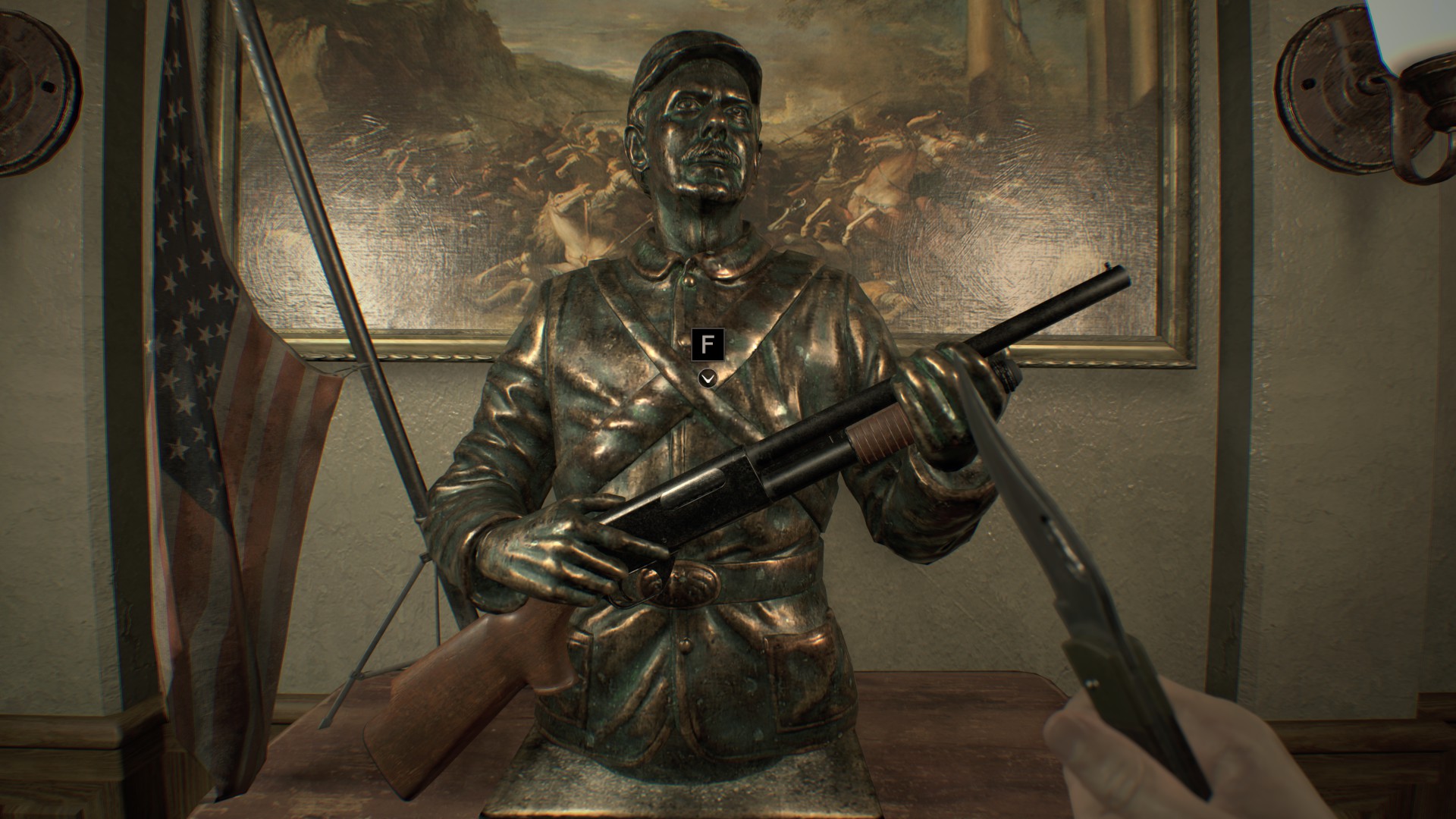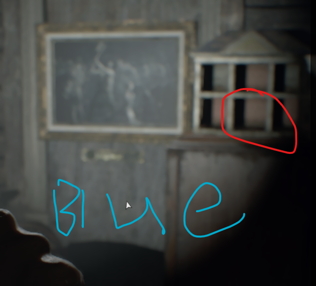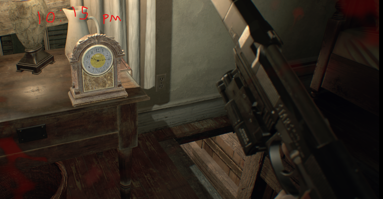 다락방으로 가서 초록색 버튼을 누르고, 저장해서 탁자 위에 있는 총을 잡는다.