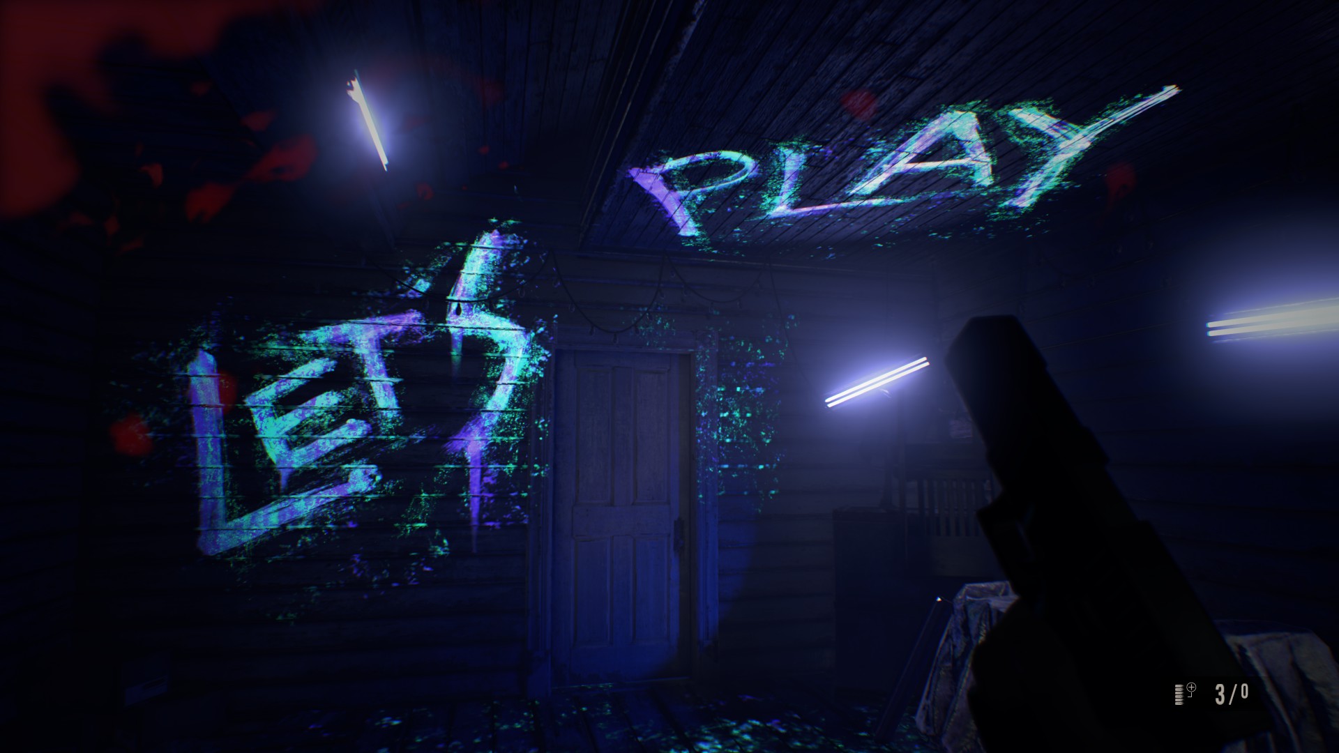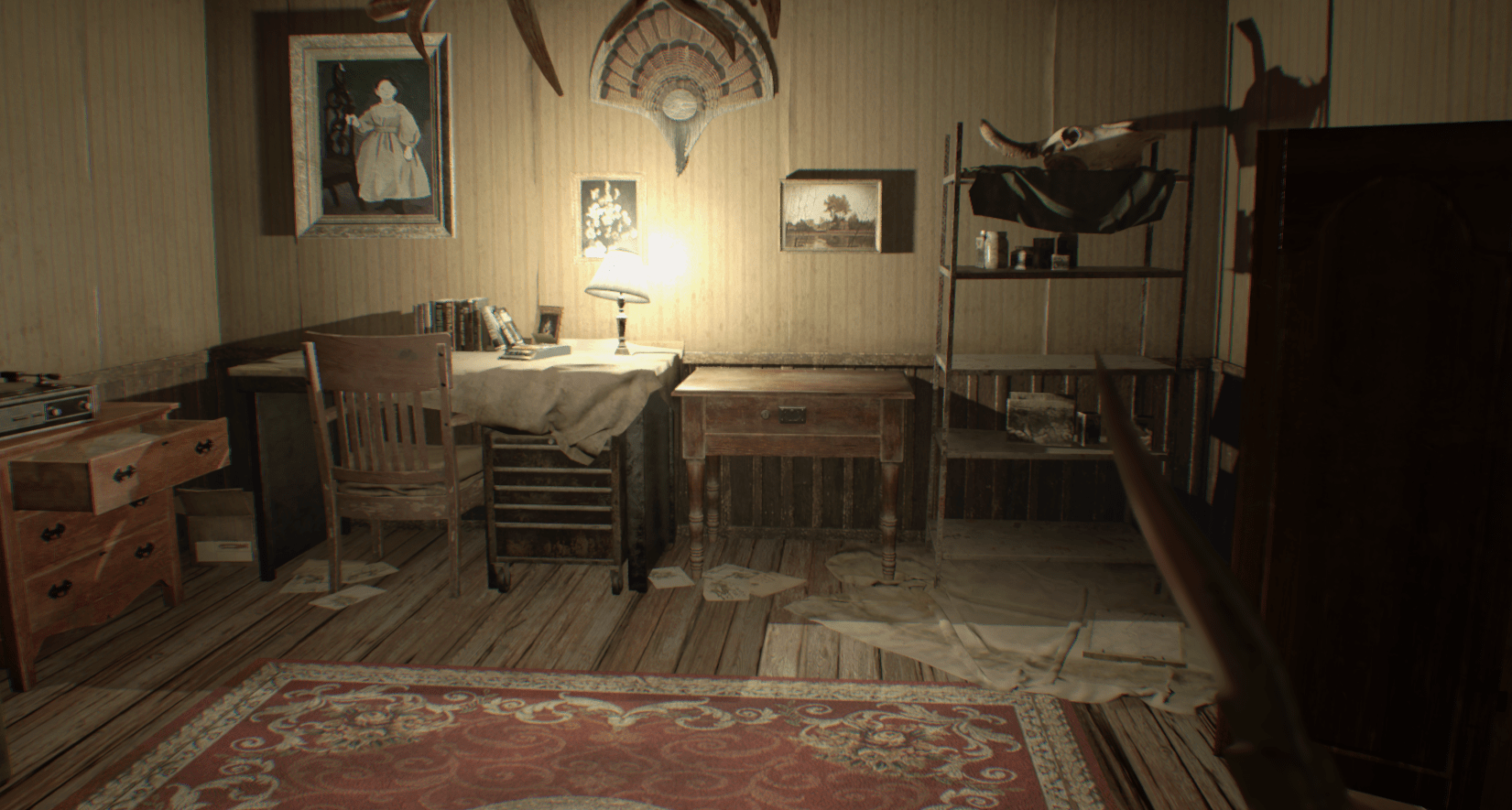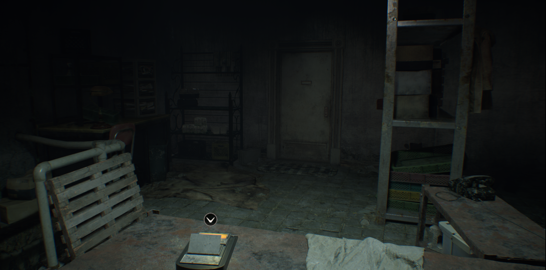 다락방으로 가서 초록색 버튼을 누르고, 저장해서 탁자 위에 있는 총을 잡는다.