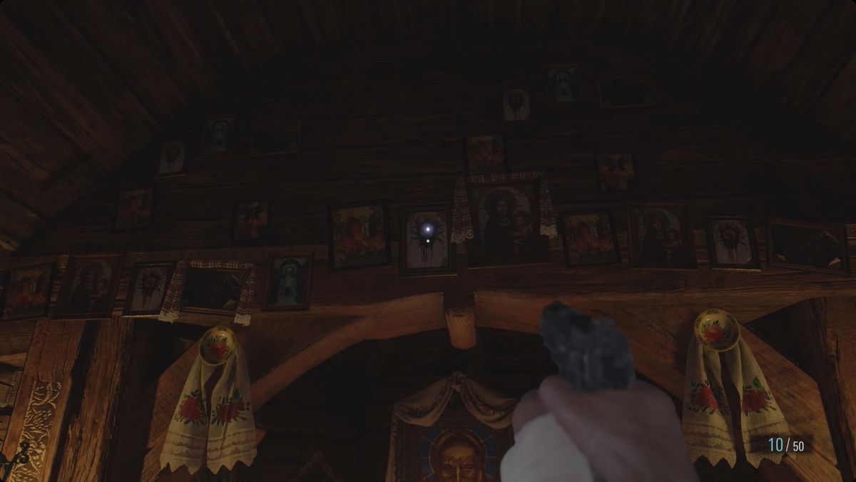 떠나기 전에 제단을 다시보고 몇 걸음 뒤로 물러서십시오. 당신 위의 벽에 그림이 있습니다. 중앙의 바로 왼쪽에는 검은 색 화환이있는 흰색 사진과 또 다른 반짝 거리는 점이 있습니다. 다른 수정 조각을 위해 쏴라 .