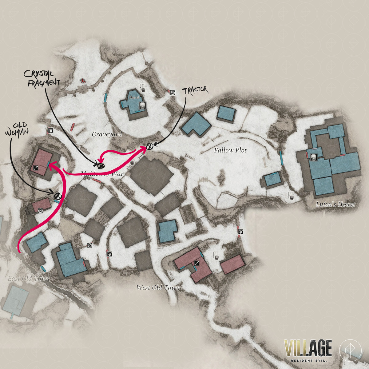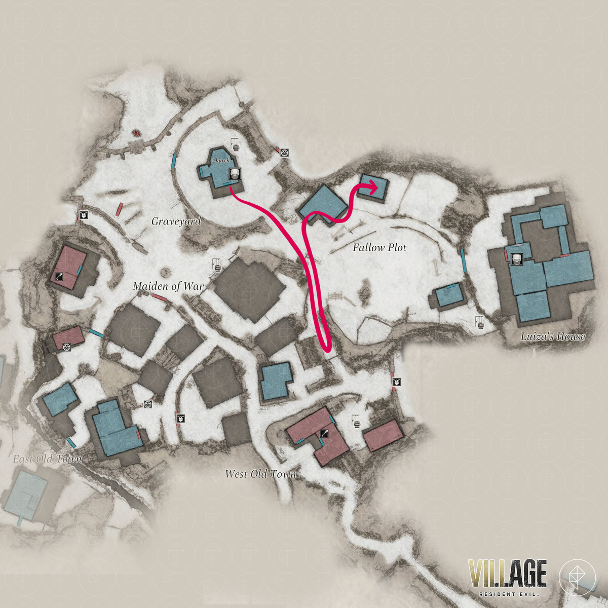 Resident Evil Village의 '성문을 여는 방법 찾기', 'Luiza 's House에서 대피소 찾기', 'Escape the house'목표는 Maiden of War , Graveyard , Church , Fallow Plot , Luiza 's House 지역을 안내합니다. 드라이버 와 함께 RE8 의 Maiden Crest 및 Demon Crest를 찾을 수있는 Old Town에 있습니다 .