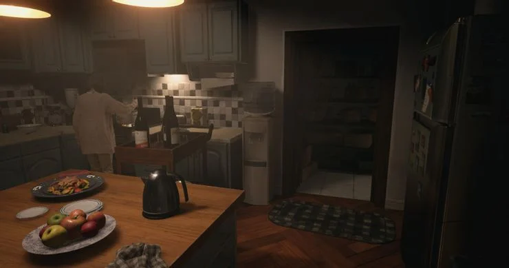 소파에서 부엌으로 걸어 가면 미아가 저녁을 요리하는 것을 볼 수 있습니다. 우회전하여 메인 복도로 향합니다. 그런 다음 정문을 향해 걸어 올라가 위층으로 가십시오 .