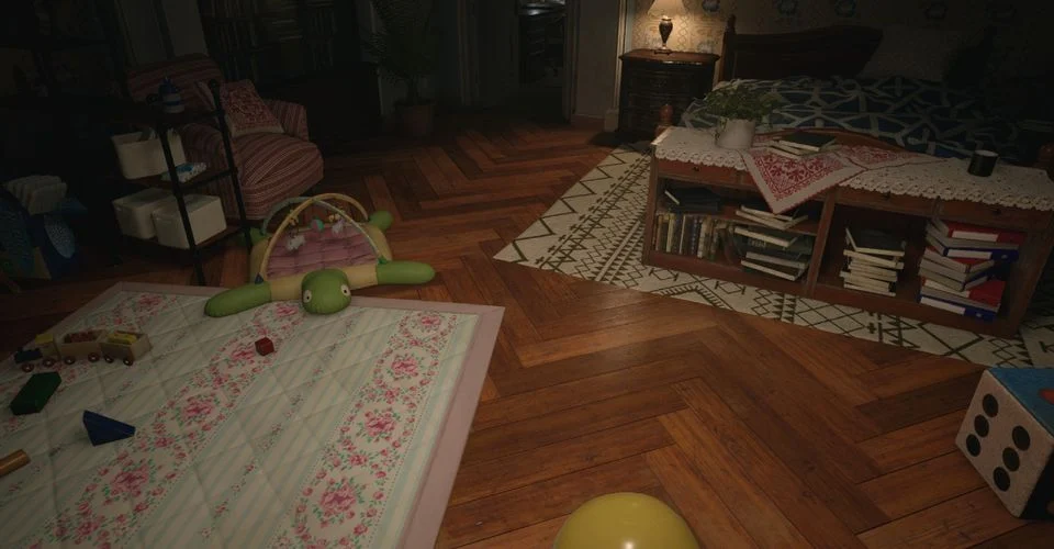 이제 로즈가 낮잠을 자고 바닥을 둘러보세요. 있다 장난감 모든 침실에 흩어져 있지만 찾을 필요가 큰 노란색 공을. 당신이 그것을 발견하면, 그것을 향해 걸어 가서 그것을 통과하십시오. Ethan의 다리를 볼 수는 없지만 공을 통과하면서 구르기 시작 합니다.