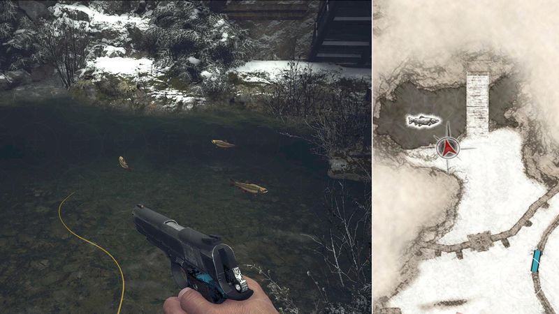 - 물고기 (1) . 레이디 디 미트 레스 쿠를 처치하고 마을로 돌아가는 길에 물에 빠지면 물고기 세 마리가 있습니다. 그것들을 놓쳤다면, 마치 Castle Dimitrescu로 돌아가는 것처럼 Castle Gate를 통해 The Village에서 북쪽으로 가십시오. 도개교 옆에있는 물에서 3 마리의 물고기를 찾을 수 있습니다.