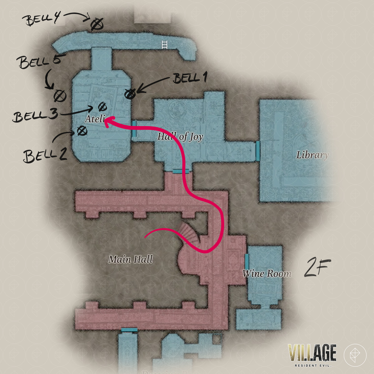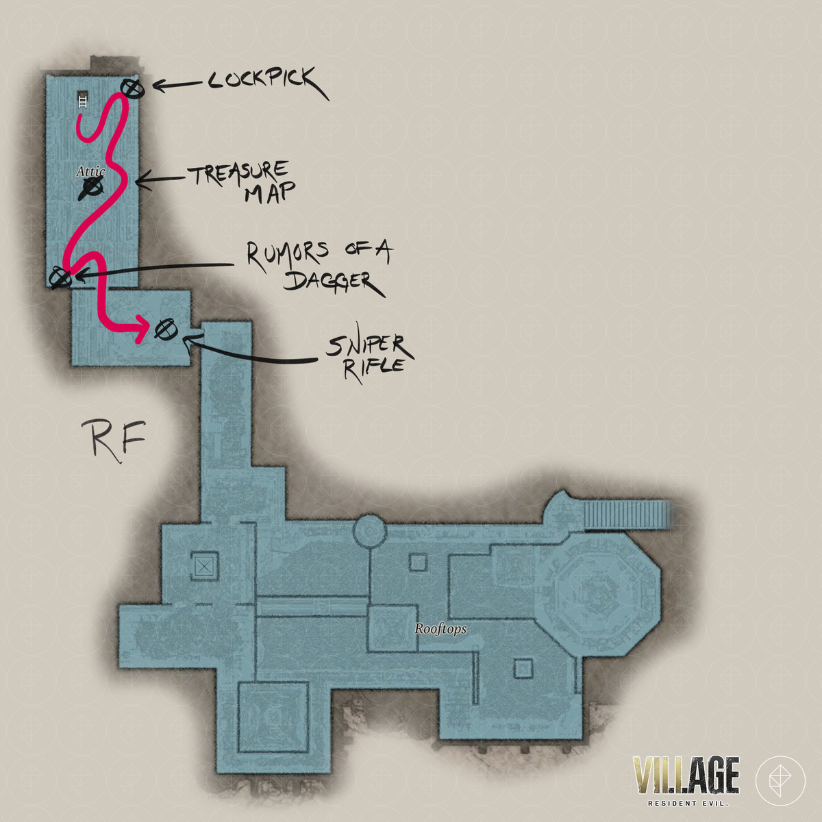 Resident Evil Village 의 “Find the Angels 'Masks : 3/4” 목표는 RE8 의 진홍색 해골 , 보물지도 , F2 소총을 찾을 수있는 아틀리에 , 다락방 , 옥상 , 종탑 , 분노의 탑 지역을 안내합니다.(스나이퍼 라이플), 마스크 오브 레이지 키 아이템.