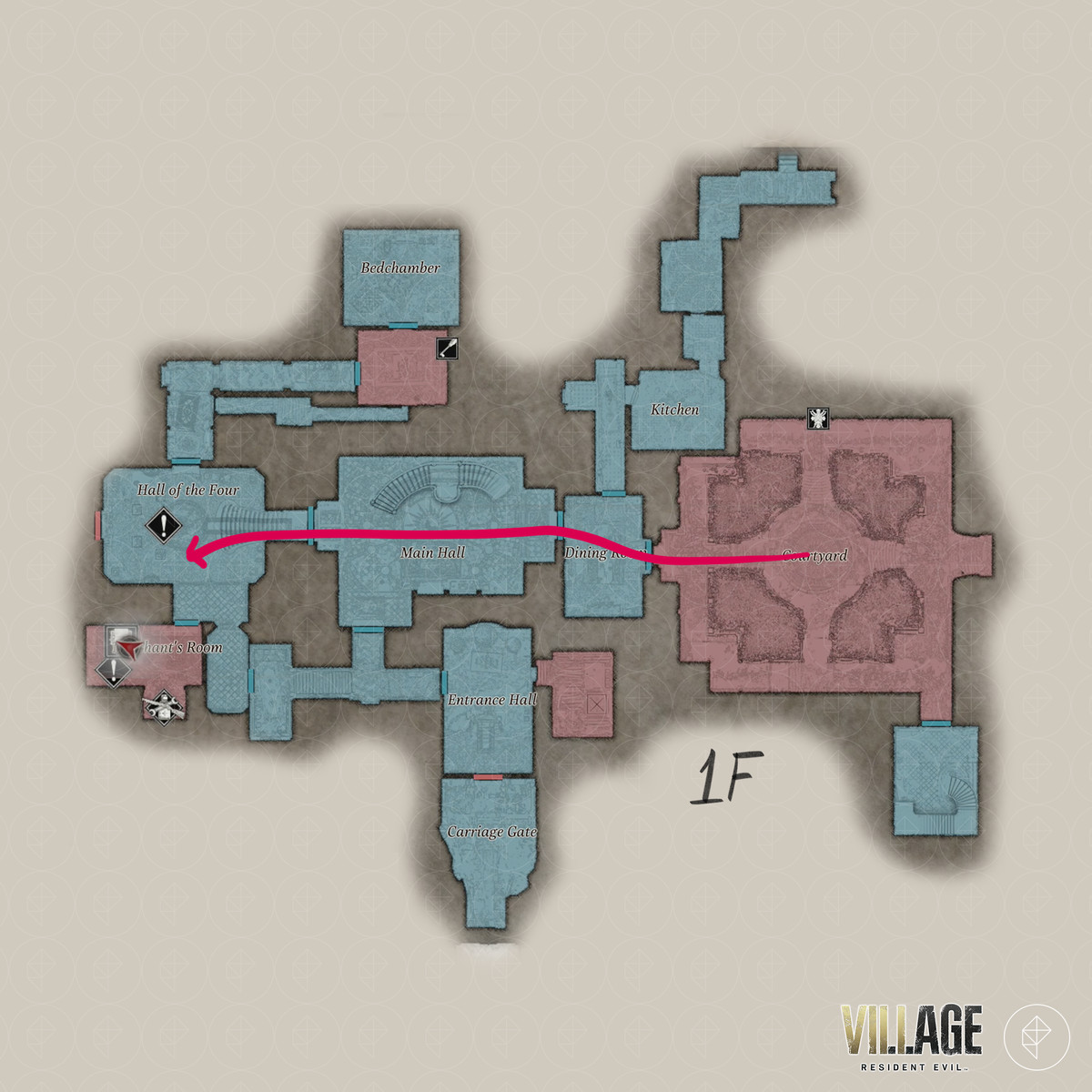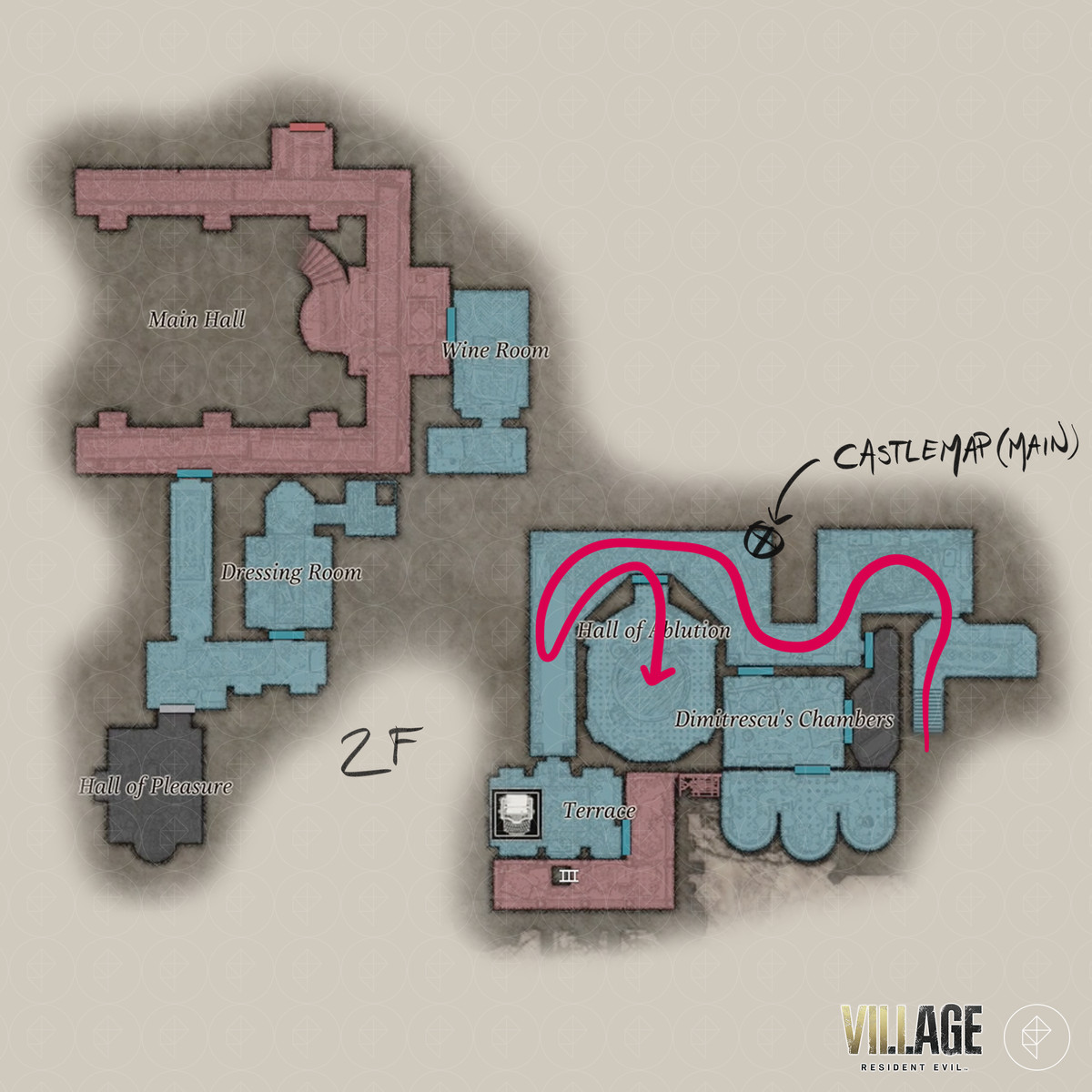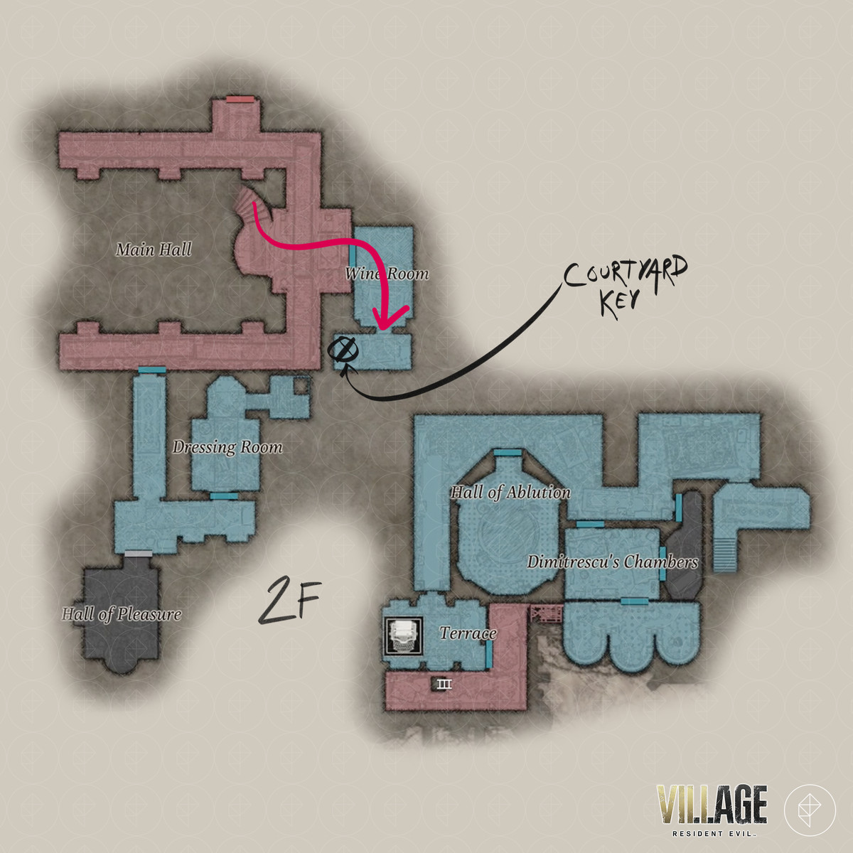 Resident Evil Village 의 'Find Dimitrescu 's chambers' 및 'Escape the castle' 목표는 주방 , 식당 , 와인 룸 , 안뜰 , 재계의 전당 , 증류소 , 테라스 , 디 미트 레스 쿠의 방 , 던전 및 슬픔의 전당을 안내 합니다. 당신은 찾을 수 RE8 의 반동 보상 - LEMI , sanguis가 처녀 자리 키 아이템, 코트 야드 키 , 성지도 (메인) 하는 수호의 염소를, 디 미트 레스 쿠의 열쇠 , 슬픔 의 가면 열쇠 아이템.