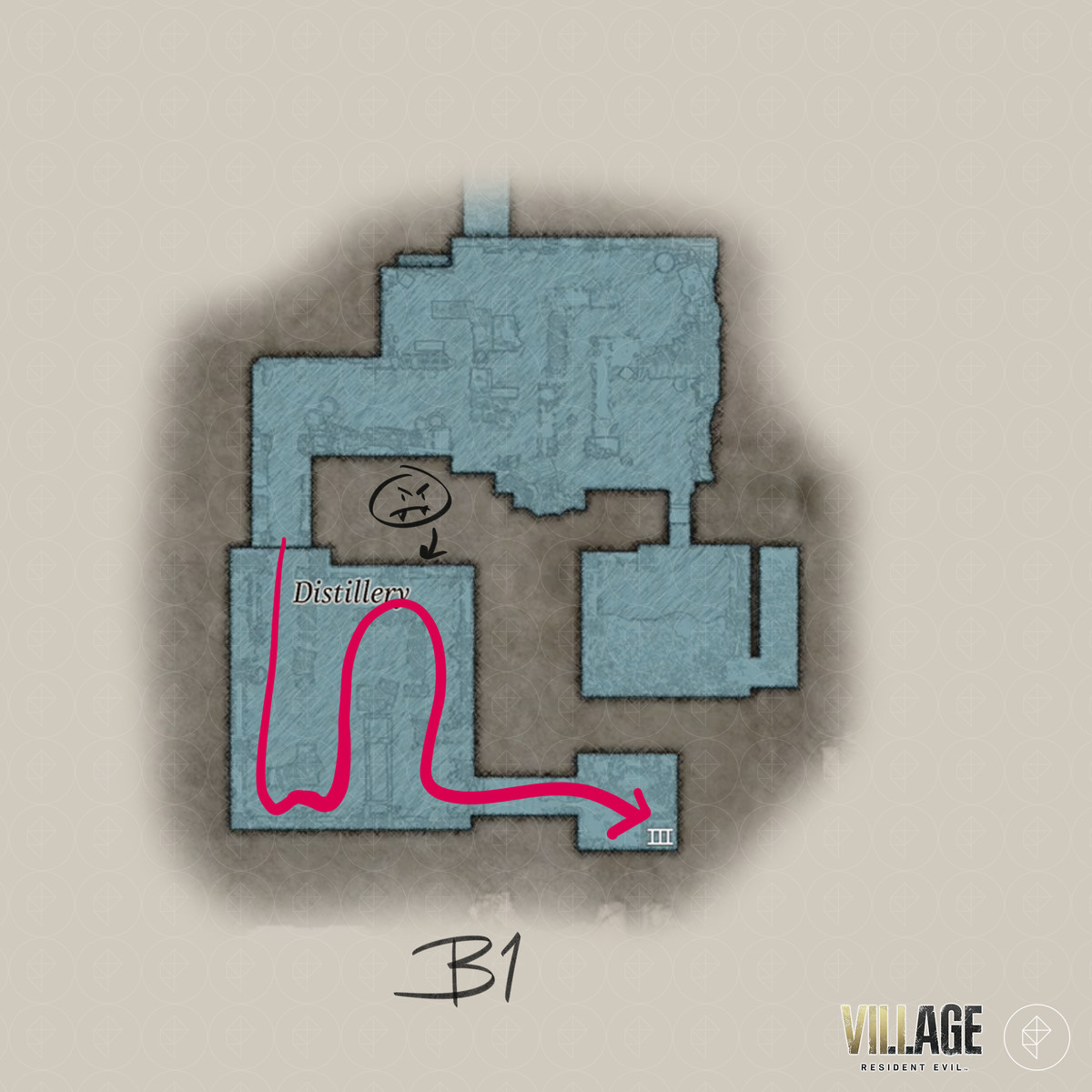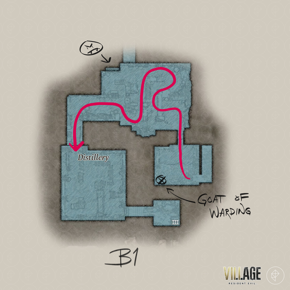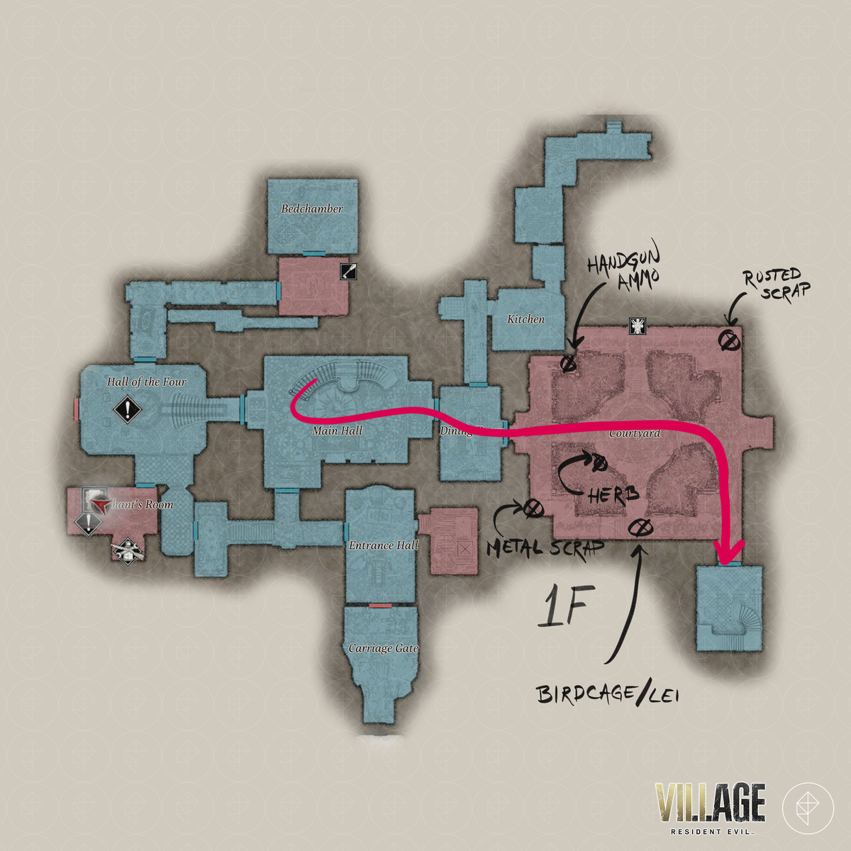 Resident Evil Village 의 'Find Dimitrescu 's chambers' 및 'Escape the castle' 목표는 주방 , 식당 , 와인 룸 , 안뜰 , 재계의 전당 , 증류소 , 테라스 , 디 미트 레스 쿠의 방 , 던전 및 슬픔의 전당을 안내 합니다. 당신은 찾을 수 RE8 의 반동 보상 - LEMI , sanguis가 처녀 자리 키 아이템, 코트 야드 키 , 성지도 (메인) 하는 수호의 염소를, 디 미트 레스 쿠의 열쇠 , 슬픔 의 가면 열쇠 아이템.