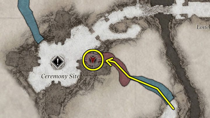 찾고있는 무기는 이미지에 표시된 오두막 안에 있습니다. 그 옆에 황금 물레 방아 무기 상자 아이콘이 있습니다. 열려면 성에서 자동으로 획득 한 강철 휘장 열쇠가 필요합니다.
