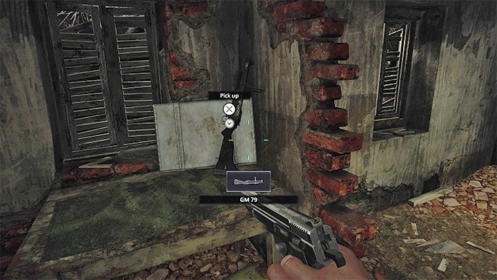 성에서 보스를 물리 치고 시작 마을로 돌아 가면 두 번째 총을 얻을 수 있습니다. Ethan은 이제 그림에 표시된 작업장 영역을 탐색 할 수 있습니다. 문이 잠겨 있습니다. 칼이나 총을 사용하여 자물쇠를 부수십시오.