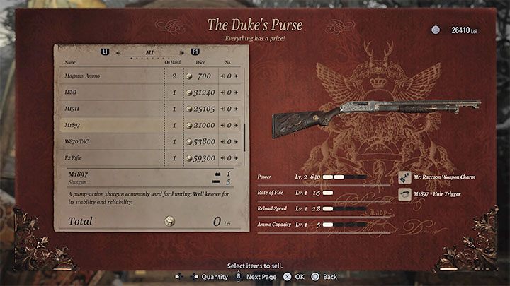 Resident Evil Village 에는 상인 Duke에게 무기를 판매 할 수있는 옵션이 있습니다. 판매 탭으로 이동하여 더 이상 사용하지 않을 무기를 선택하십시오.