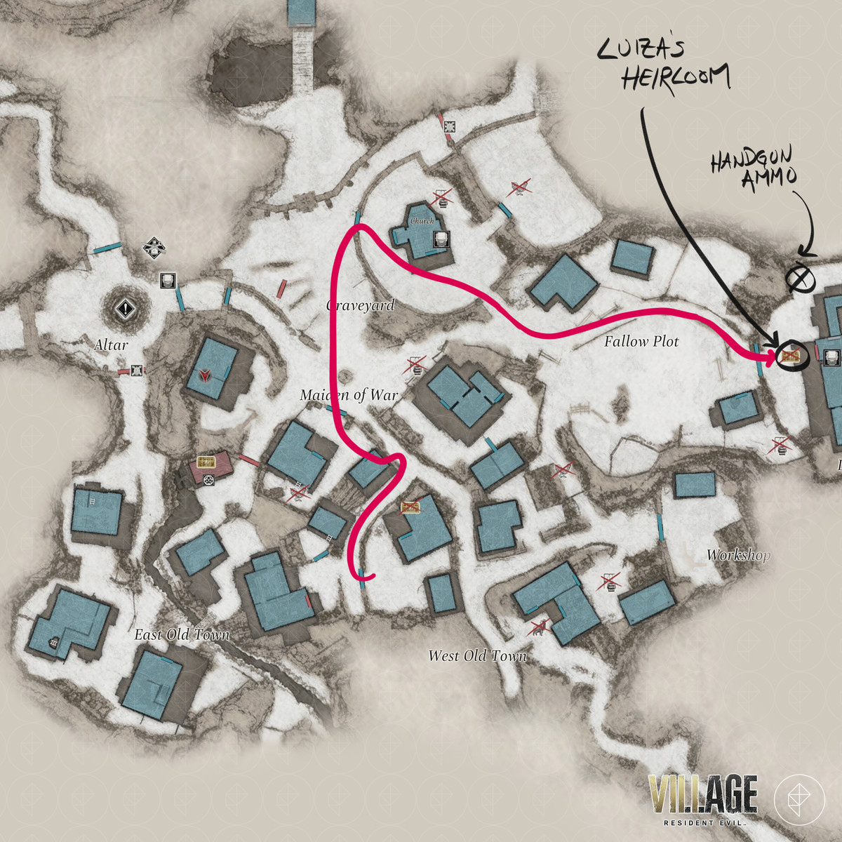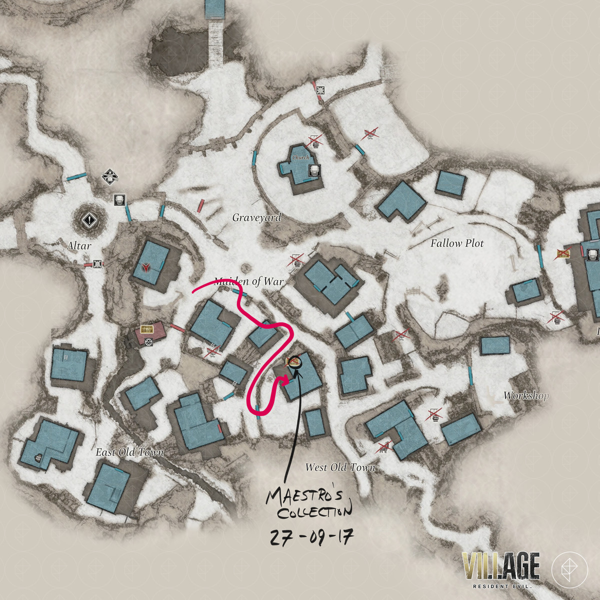 Resident Evil Village 의 "Collect Rose : 2/4" 목표를 계속 진행하기 전에 Graveyard , Maiden of War , Luthier 's House 및 Luiza 's House 지역에서 RE8 의 이상한 새를 찾을 수 있습니다 . Maestro 's Collection , Steel Hræsvelgr , F2 Rifle – High-Capacity Mag., Luiza의 가보 및 Luiza의 목걸이 , Beneviento의 보물 , Giant Crystal Axe , 깨진 석판 열쇠 아이템.