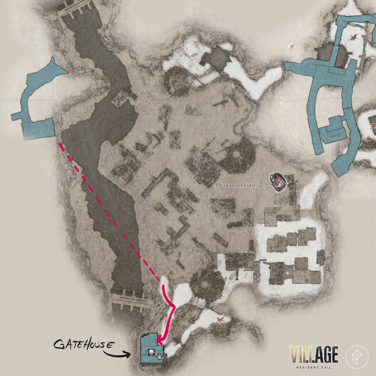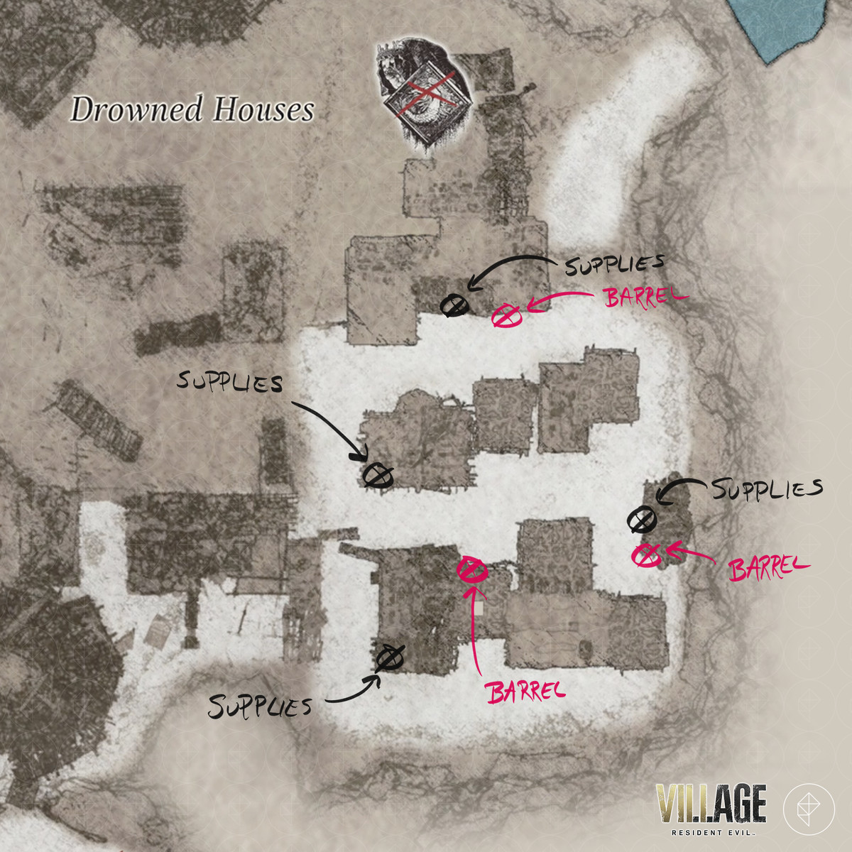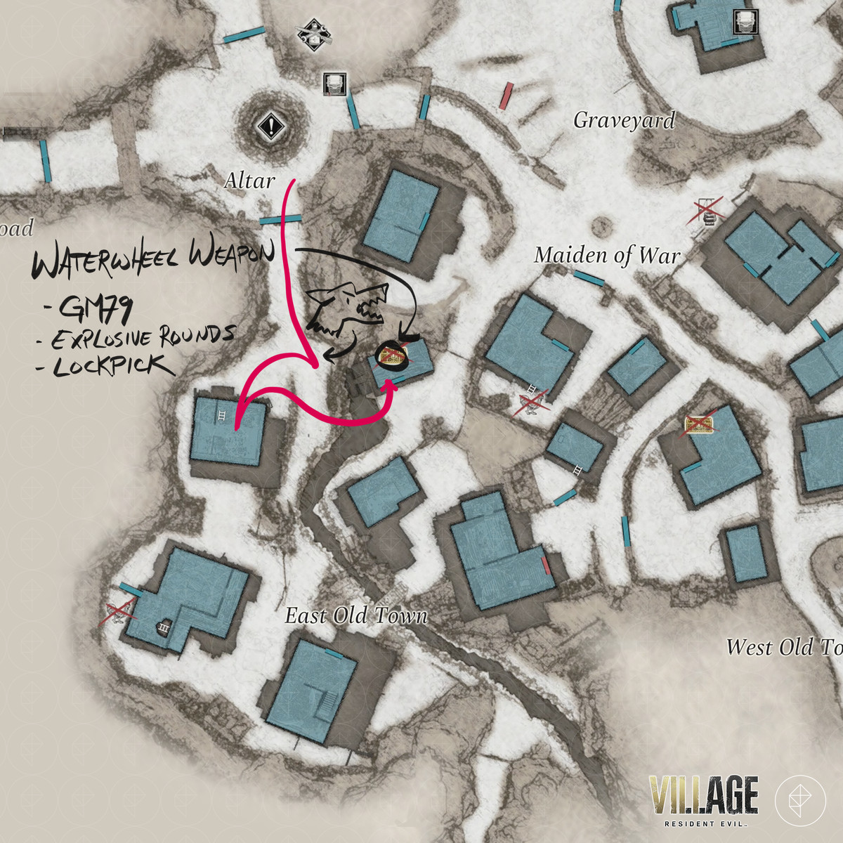 레지던트 이블 빌리지 의 "장미 수집 : 2/4", "모로 탈출", 수문으로 전기 켜기, 수문 열기 " 및 "출구 찾기 " 목표를 통해 East Old 를 통과 할 수 있습니다. RE8 의 Waterwheel 무기를 찾을 수있는 Town, Windmill Shack, 저수지, Drowned Houses 및 Moreau의 실험실 지역— GM 79 유탄 발사기 , 자물쇠 , 희귀 동물 사진 , 보트 키 , M1911 – 대용량 매거진. , 크랭크 , 머메이드 볼 ,M1851 Wolfsbane, Chartreuse Skull , Pigeon Blood Stone , Six-Winged Unborn 주요 키 아이템.