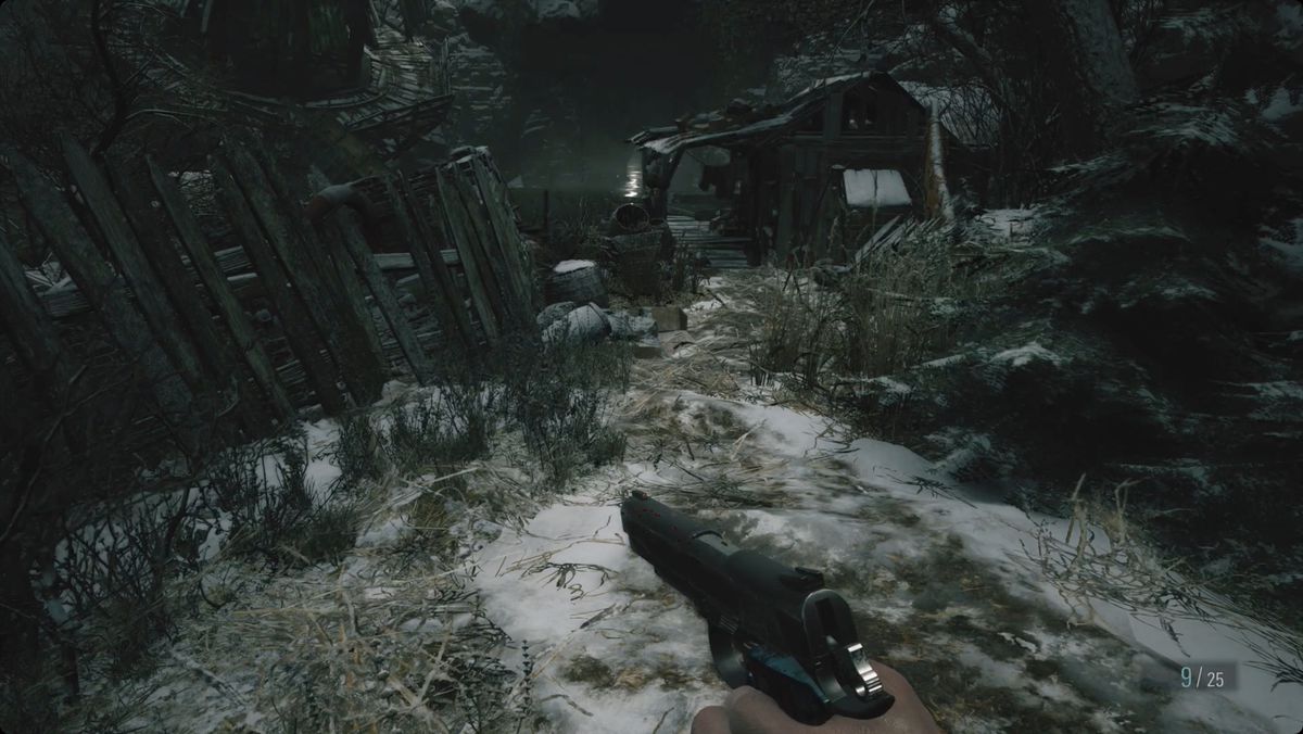 북쪽으로 향하는 방을 건너십시오. 나무 아래 에서 약초 를 잡고 물 속으로 걸어가 보트에서 권총 탄약 을 찾으십시오 . 저격 소총 탄약을 위해 도크의 배럴을 부수십시오 . 집 북쪽에 저격 총 탄약 이 더있는 또 다른 배럴이 있습니다 .