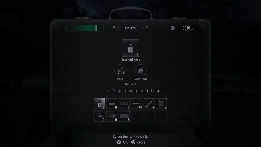 Crafting 메뉴에 액세스하려면 Triangle을 누른 다음 R1을 눌러 한 번 스크롤하십시오. 이제 하나의 아이템 만 제작하면 트로피가 잠금 해제됩니다. 가장 간단한 방법은 Herb 및 Chem Fluid를 사용하여 응급 처치 약을 만드는 것입니다.