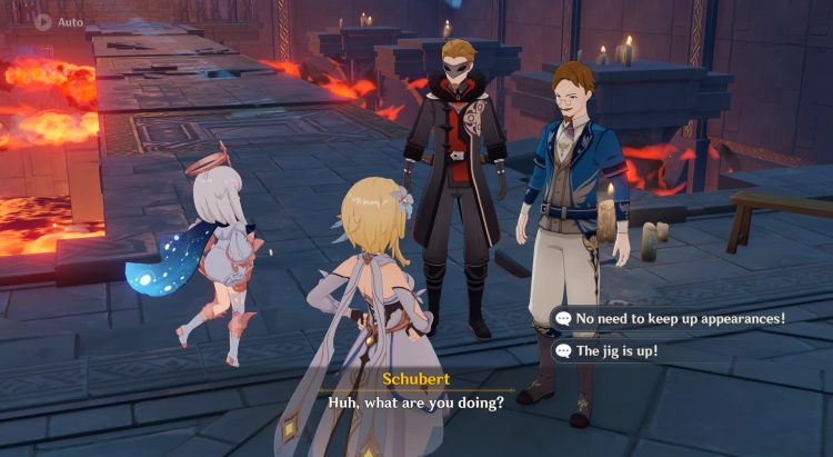 가까운 도메인에 들어가면 Schubert의 새로운 "친구"가 실제로 Fatui 에이전트라는 것을 알게 될 것입니다. 슈베르트가 몬트 슈타 트에서 로렌스 가문의 지배권을 되찾고 싶어하는 것 같지만 여행자와에 울라는 그의 계획을 중단 할 것입니다.
