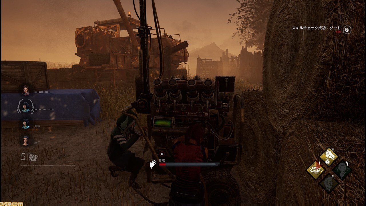 우선 서바이버에서 소개하자. 서바이버는 캐릭터마다 이동 속도 등의 차이는 없지만, 각각 고유의 능력인 “파크”를 가지고 있어, 그 파크를 구사해 탈출을 목표로 하게 된다(파크는 입수 후, 다른 서바이버에서도 사용 가능). 서바이버는 탈출을 위해 발전기를 수리하게 되고, 맵에 있는 총 7개 중 5개를 수리함으로써 게이트가 통전하여 거기에서 탈출할 수 있다.