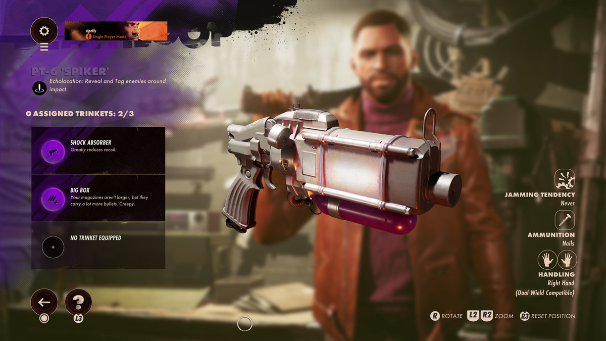 Spiker는 Deathloop 에서 가장 좋은 무기 중 하나입니다. 어디서든 일찍 발견할 수 있고 조용하고 헤드샷으로 즉시 사살할 수 있기 때문입니다. 은신과 은신에는 완벽하지만, 총격전에는 좋지 않다. 그것으로 시작하지만 상황이 엉뚱한 방향으로 흘러갈 때 즉시 더 나은(더 큰) 무기로 전환하십시오.
