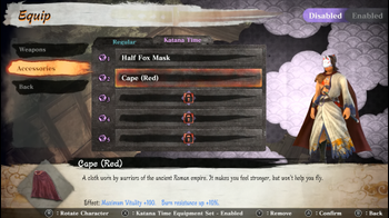 각 검에는 Katana Time을 통한 슈퍼 파워업 모드가 있습니다. 캐릭터를 더 빠르게 움직이게 하고 공격을 더 빠르게 하며, 한정된 시간 동안 장착한 검을 무적 상태로 만듭니다. Katana Time에는 3개의 계층이 있으며 모두 채워진 상태에서 완전히 해제하면 공격에도 특별한 화려한 효과를 줍니다. 이들은 종종 불의 벽, 치솟는 바람의 흐름, 대지에서 폭발하는 간헐천 등과 같은 원소 맹공격의 형태로 나타납니다. 장착한 3개의 무기 각각에는 상호 배타적인 카타나 시간 표시줄이 있으므로 더 힘든 만남을 위해 카타나 시간 활성화의 건전한 재고를 확보하려면 두 무기를 자주 전환하는 것이 좋습니다.