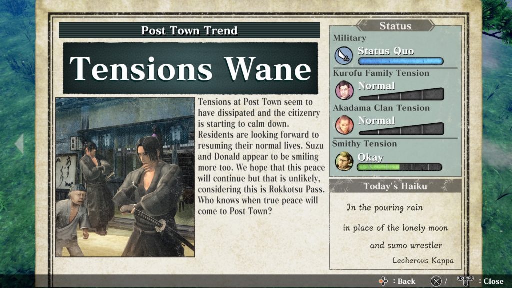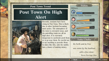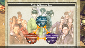 Kurofu Family, Akadama Clan 및 Post Town Faction은 게임 전반에 걸쳐 머리를 맞대고 있습니다. 마을 신문과 대장간 밖에서 벌어지는 끊임없는 싸움에 대해 듣게 될 것입니다. 사실, 하루에 세 명의 가게 주인은 모두 각 파벌의 대표자이지만, 서로 또는 무작위 우회로와 자주 싸우기 때문에 당신을 도울 수 있는 가능성은 끊임없이 유동적입니다. 경호원을 고용하거나 특정 품목을 구매하는 등 특정 서비스가 필요한 경우 즉시 방문을 제공한 후 다음 날까지 기다려야 하는 경우가 종종 있습니다. 운 좋게도 이 가게 주인 중 한 명이 전투에서 죽더라도 다음 날에는 항상 대체자가 있습니다.