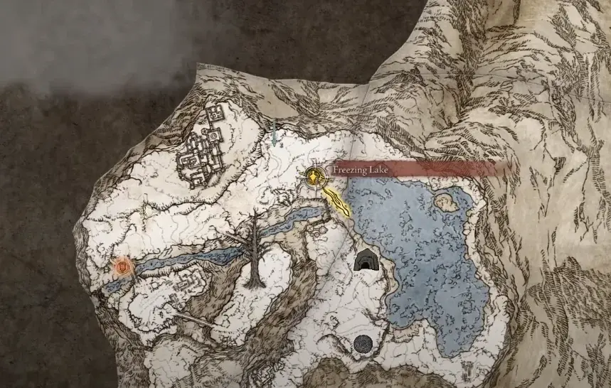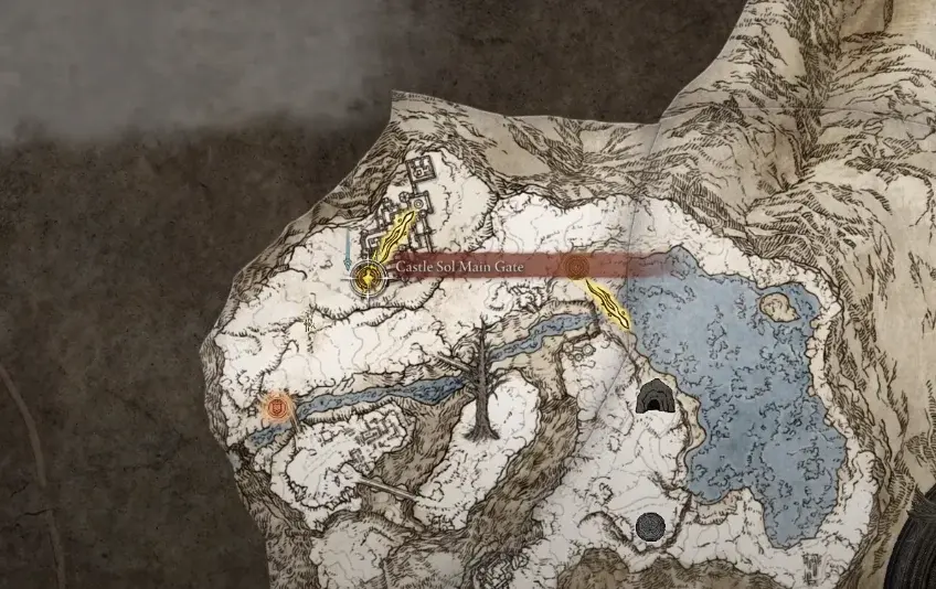 자, 왼쪽 Haligtree 메달리온의 위치에 대해 Rold의 리프트를 사용하여 상승합니다. 그곳에서 계속 북쪽으로 가셔서 은총의 얼어붙은 호수 부지에 도착해야 합니다. 이 지역의 지도를 잠금 해제하면 지도 최북단에 솔 성(Castle Sol)을 볼 수 있습니다.