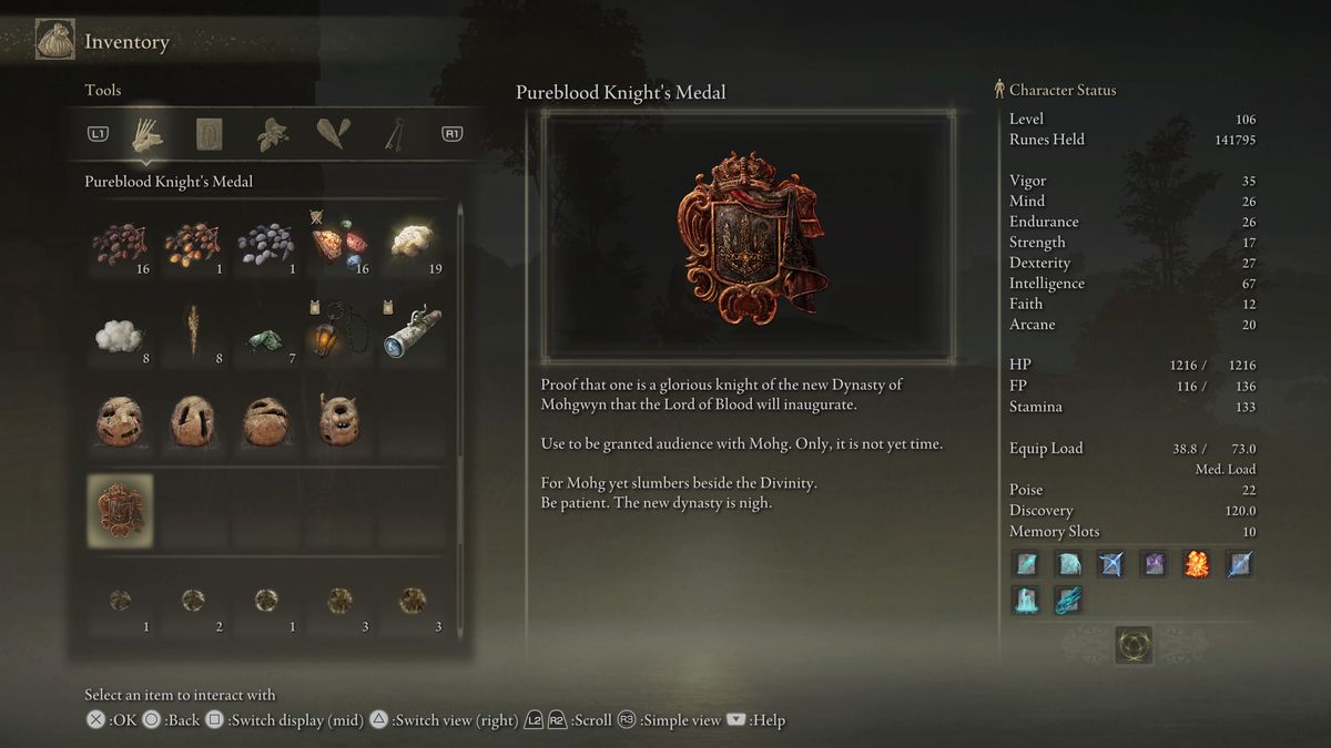 순혈 기사의 메달 아이템 설명에는 "아직 신의 곁에서 잠을 자고 있는 모그를 위해" 블러드의 군주 모그를 만날 시간이 아니라는 내용이 나와 있습니다. 인내심을 가지세요. 새 왕조가 가까웠다.”