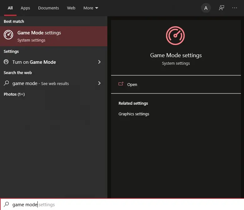 - Windows 검색을 열고 "게임 모드"를 입력하기만 하면 됩니다. 첫 번째 결과를 클릭합니다.