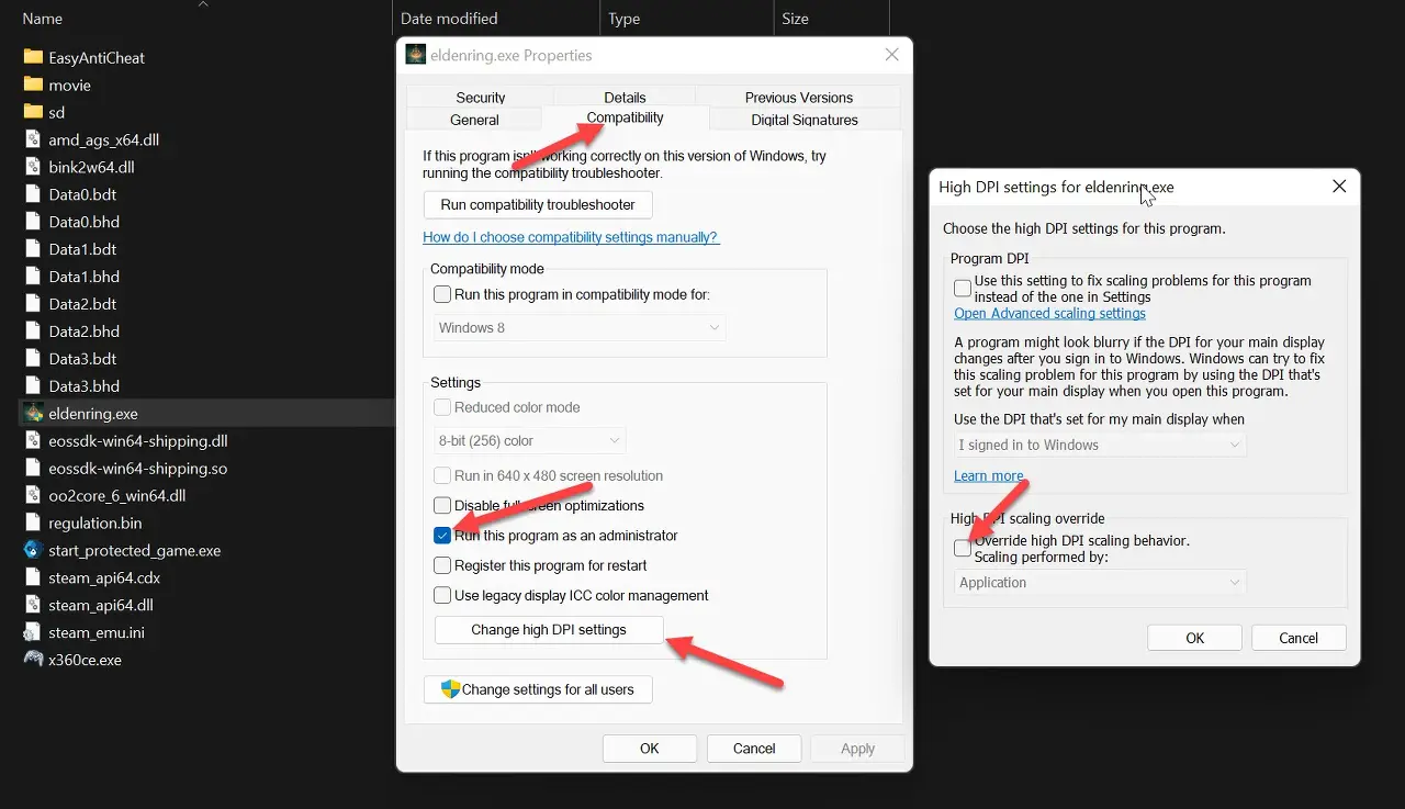 Elden Ring을 관리자로 실행하고 DPI 조정 무시 비활성화