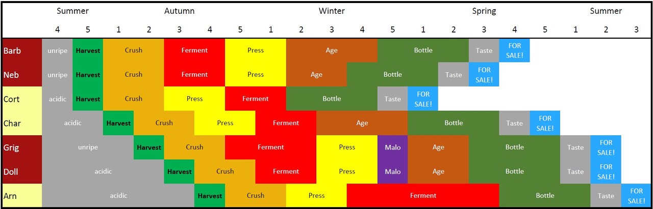 먼저, 이 차트는 각 포도를 색상별로 표시한 다음 잠금을 해제하는 순서를 표시하고 각 포도가 일반적으로 수확과 병으로 판매되는 각 단계를 거치는 시기를 표시합니다. 포도밭은 어떤 포도를 어떤 양질의 토양에서 재배했는지, 더 나은 트랙터에 투자하여 수확하는 데 걸리는 시간을 줄이는 것과 같이 포도를 재배하고 가공하는 데 사용하는 기술에 따라 달라집니다. 차트를 통해 장비 요구 사항을 예측하거나 너무 적은 수의 프레스와 같은 생산 병목 현상을 줄이기 위해 재배할 포도를 선택할 수 있습니다. 병에 넣는 기계는 특히 병에 넣을 와인이 너무 많아 탱크가 다음 수확을 위해 준비되지 않은 경우 문제를 일으킬 수 있습니다.