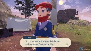 다음 목표는 Bidoof, Starly 및 Shinx를 잡는 것입니다 ( 그림 16 ). 옵시디언 필드랜드 입구까지 동반자를 따라가면 컷신이 바로 비두프( 그림 17 )로 연결됩니다. " 001 – 낯선 땅에서 "( 그림 18) 라는 제목의 주요 임무에서와 같이 접근하여 포켓볼을 던지십시오 .