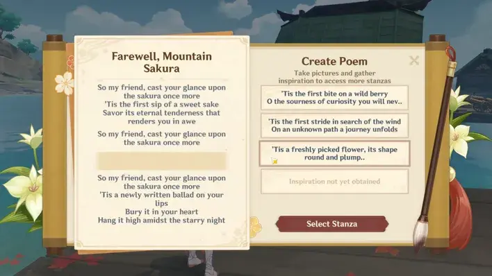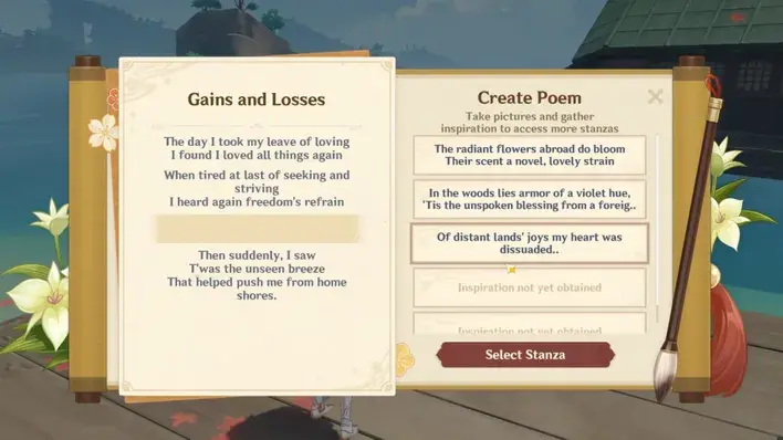 준비하고 캡처한 사진으로 시인이 쓴 제공된 구절 중 하나를 선택할 수 있습니다. 선택한 구절이 시나 완료 시 획득하는 보상에 직접적인 영향을 미치지 않기 때문에 잘못된 옵션은 없습니다.